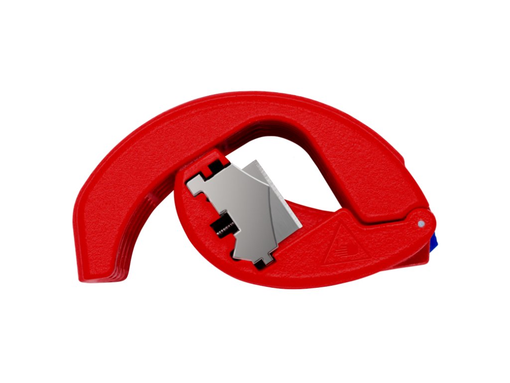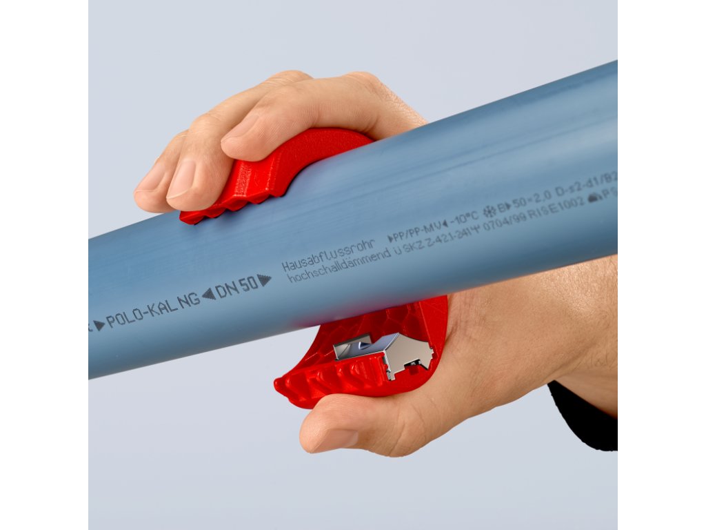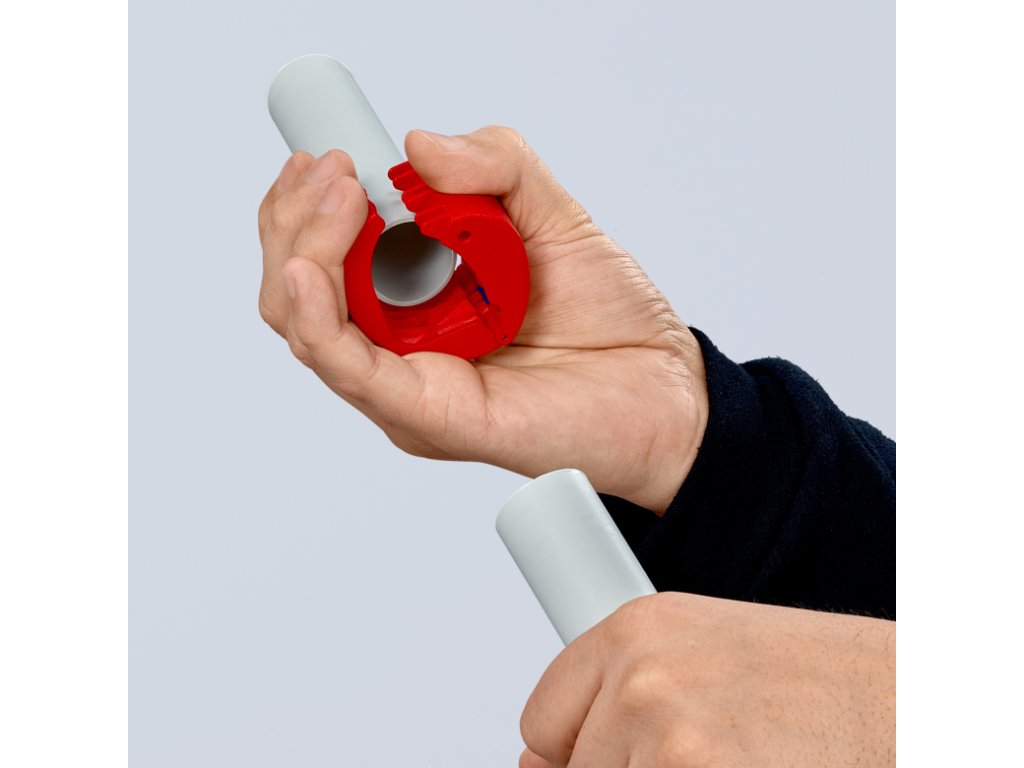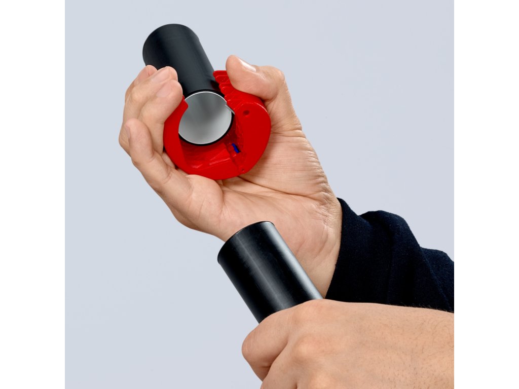 Rezačka plastových rúrok s vymeniteľným ostrím, na rezanie potrubia a tesniacich manžiet, rozsah 20-50 mm – KNIPEX 90 22 10 BK.