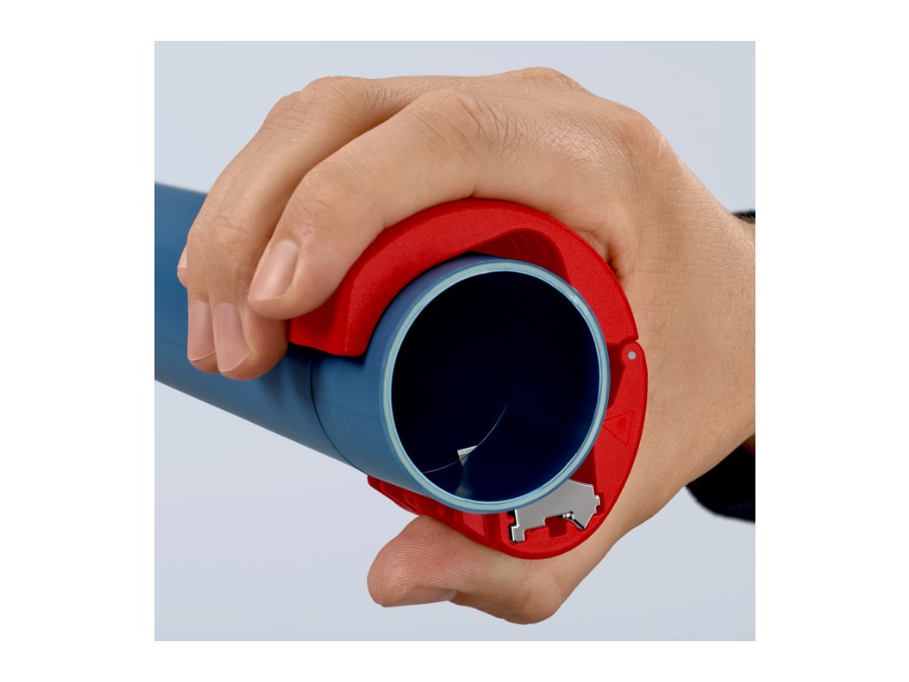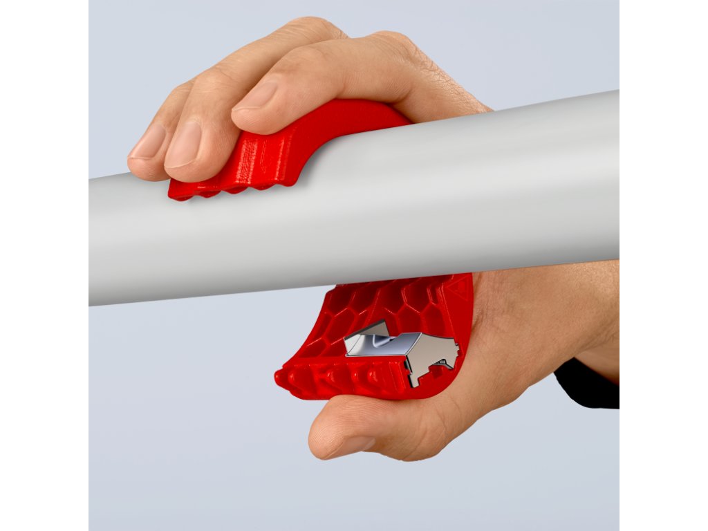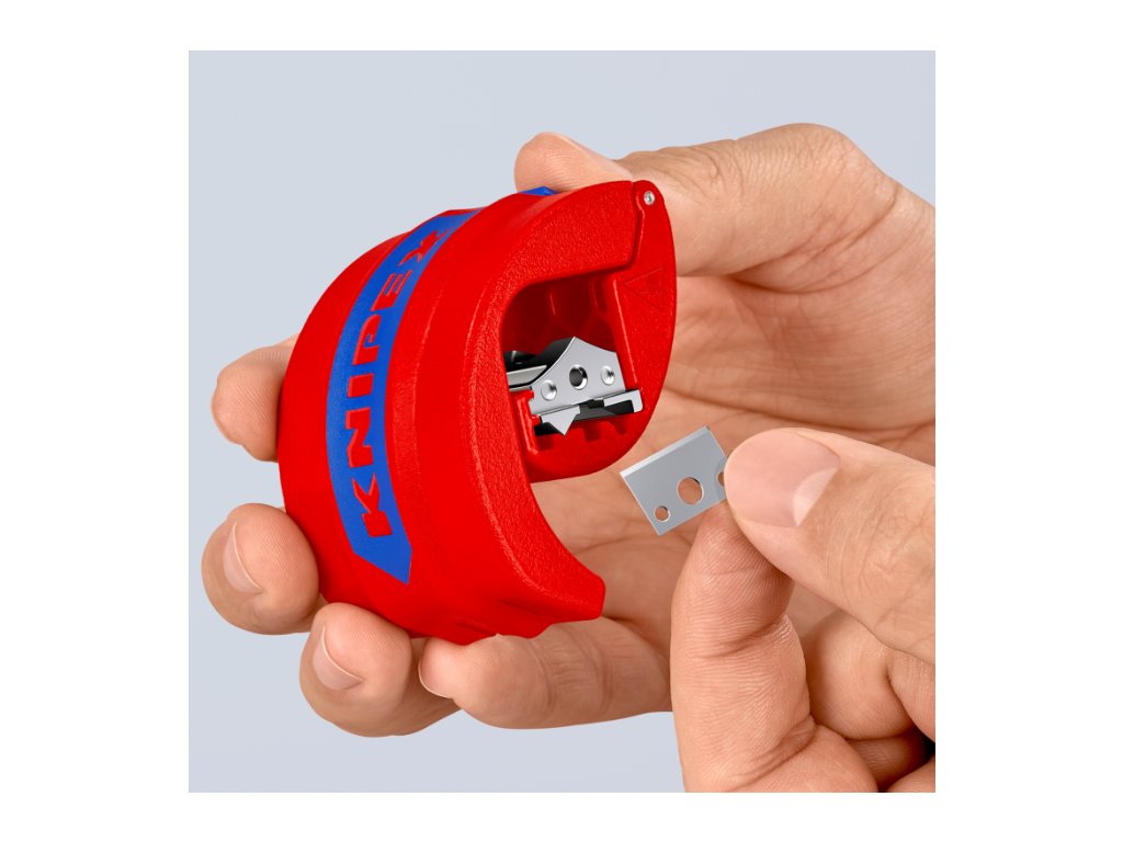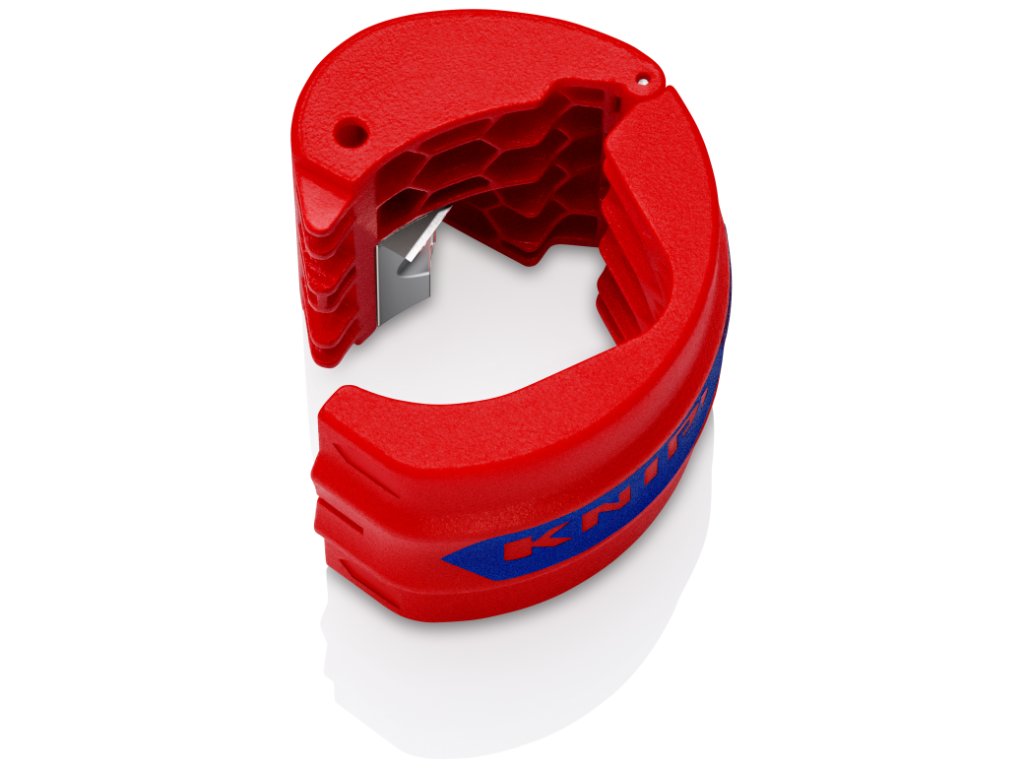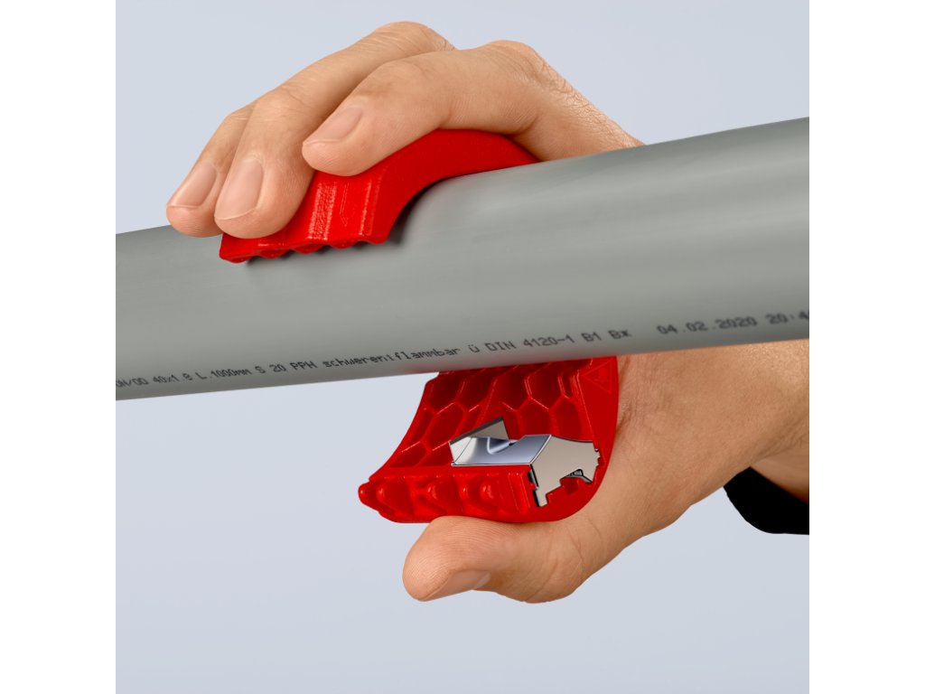 Rezačka plastových rúrok s vymeniteľným ostrím, na rezanie potrubia a tesniacich manžiet, rozsah 20-50 mm – KNIPEX 90 22 10 BK.
