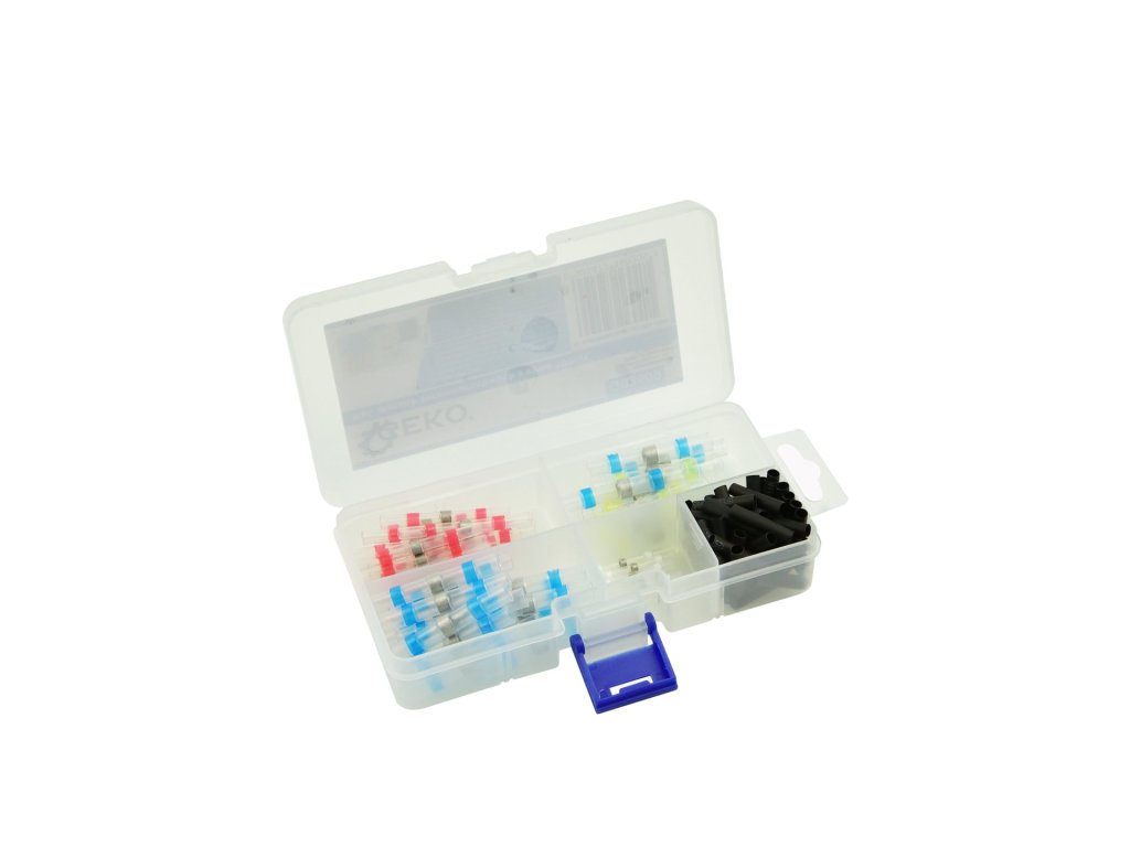 Zmršťovacie bužírky (teplem zmrštiteľné hadičky) s cínom vo vnútri, rôzne priemery, rôzne farby, sada 100 kusov v plastovej kazete – GEKO G03609