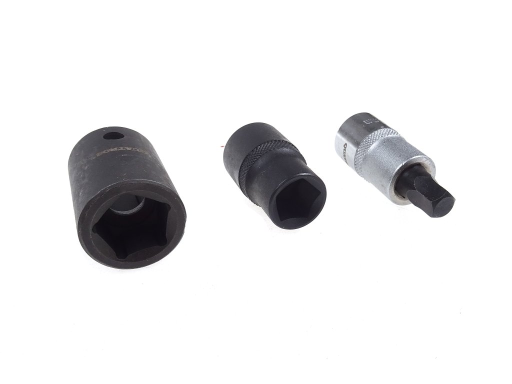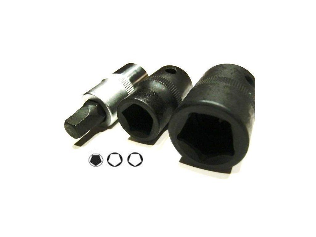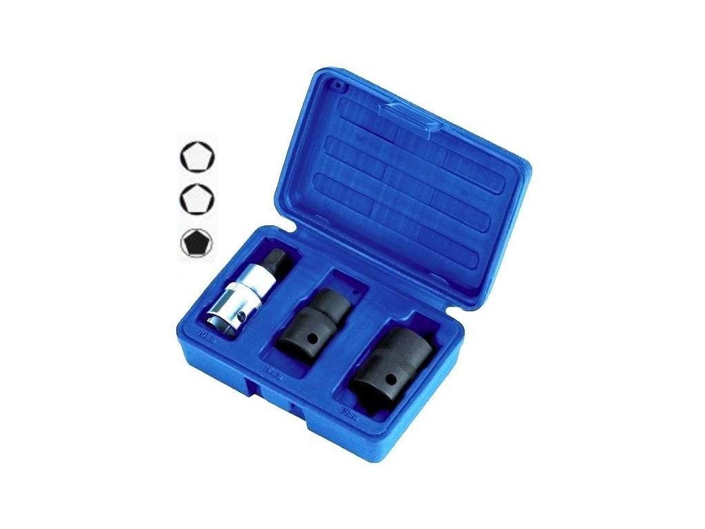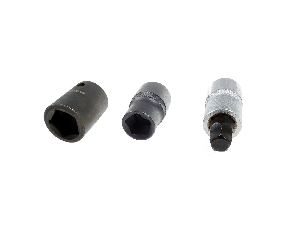 Sada obsahuje tri nástrčkové kľúče s netypickým pětihranným profilom na brzdové strmene vozidiel: