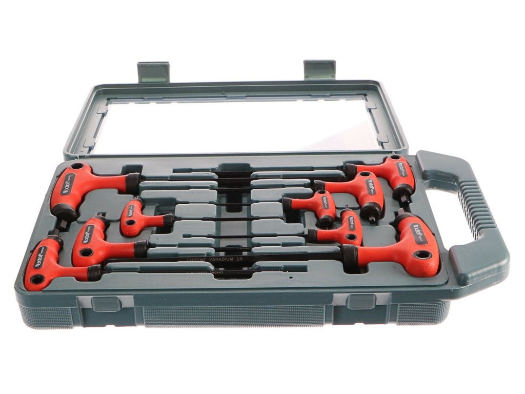 Plastové ergonomické rukoväte v tvare T pre pohodlnú prácu. Dlhšie konce sú s guličkou. Profesionálna kvalita – chróm-vanádiová oceľ, dlhšie konce čiernené.