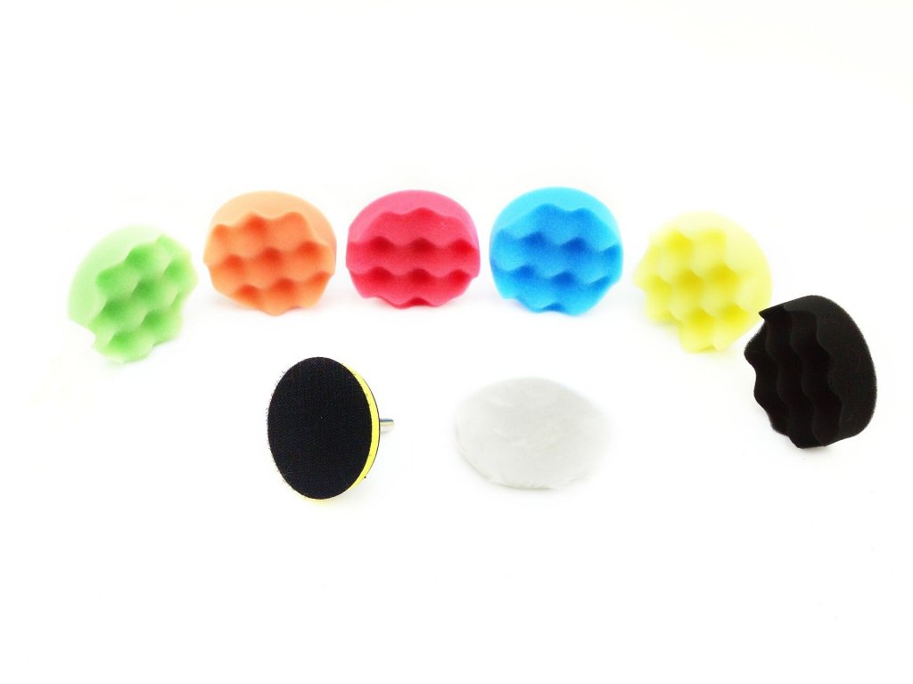 Hubky - kotúče na leštenie karosérií áut a motoriek, priemer 80, rôzne tvrdosti, úchyt do skľučovadla vŕtačky M10x2, sada 9 dielov - GEKO G00882