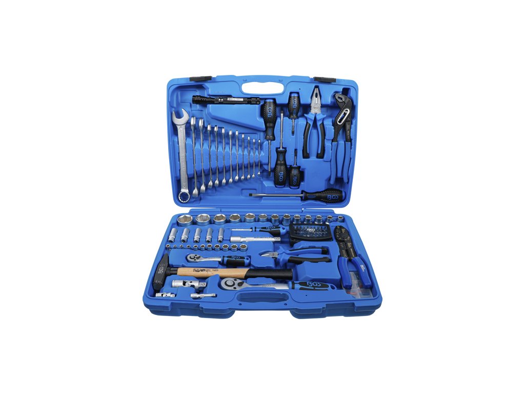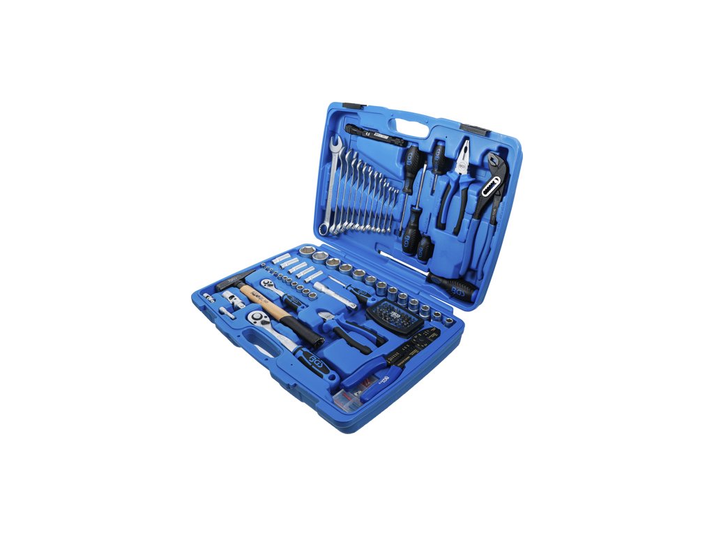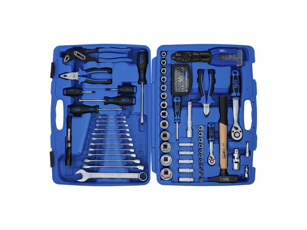 Veľká súprava ručného náradia: súpravy gola 1/4" a 1/2", kladivo s okom, kliešte a skrutkovače, 117 dielov v plastovom kufríku - BGS technic 9029