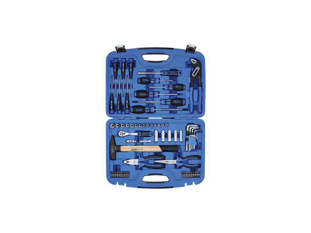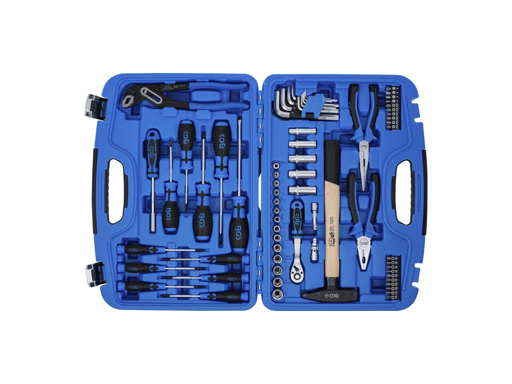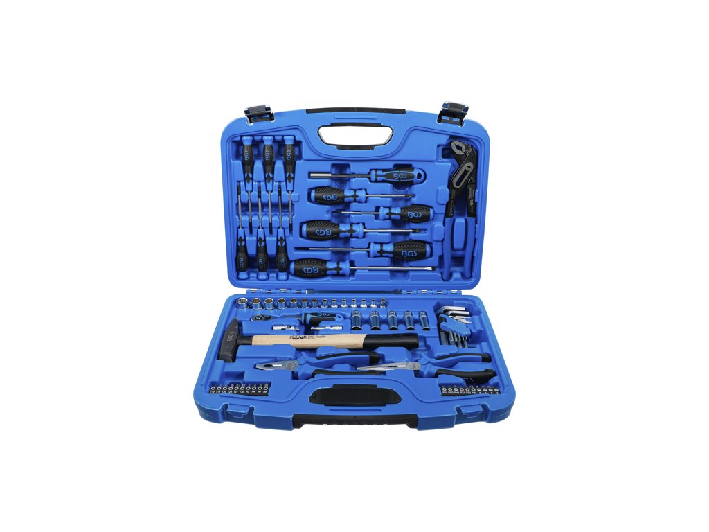 Sada ručného náradia: holá sada 1/4", bity, kladivo, kliešte a skrutkovače, 67 dielov v plastovom kufríku - BGS technical 2217