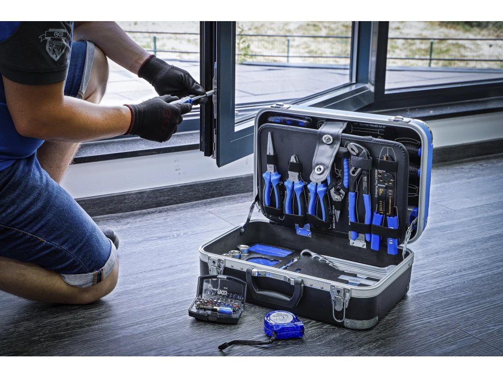 Kufrík s ručným náradím: sada 3/8" goly, kliešte, kľúče, skrutkovače, vodováha, 106 dielov - BGS technical 15505