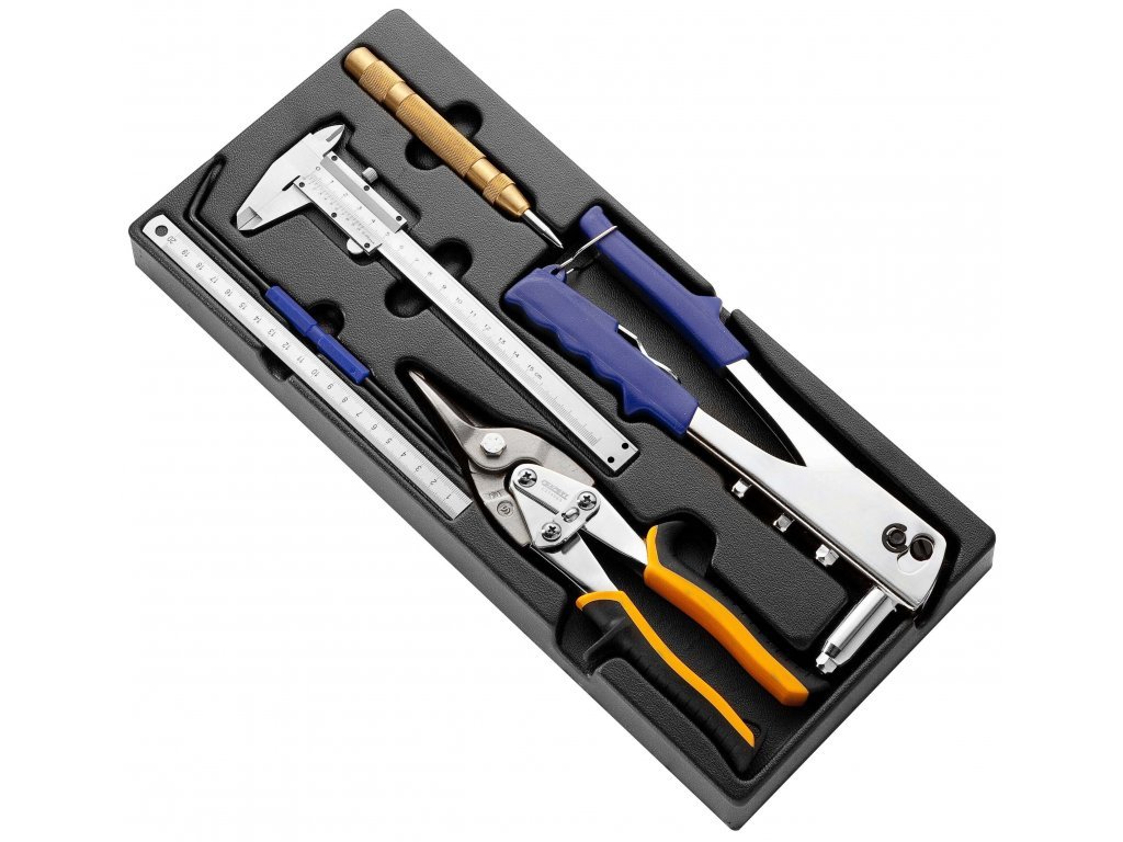 nitovacie kliešte, automatický jamkár, oceľová rysovaciu ihla, nerezová mierka 200 mm, posuvné měřítko1 / 20, priame prevodové nožnice na plech