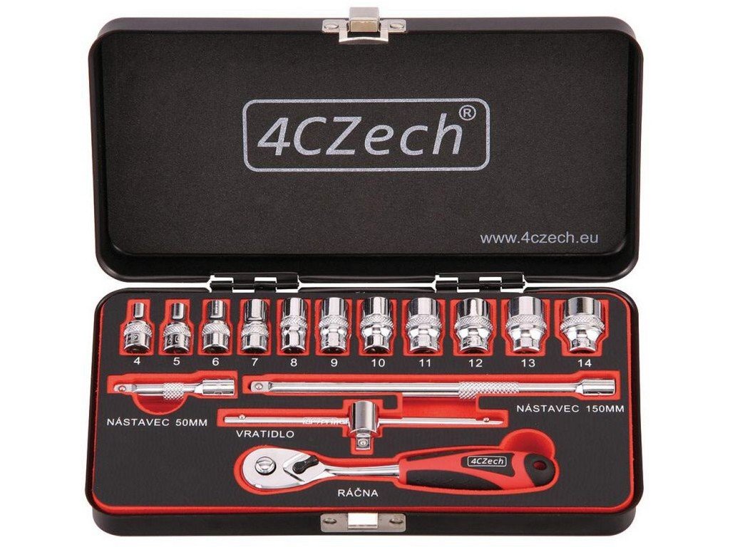 Sada nástrčných hlavíc 1/4" s račňou, nástavcami a vratidlom, 4-14 mm, 15 ks - 4CZech