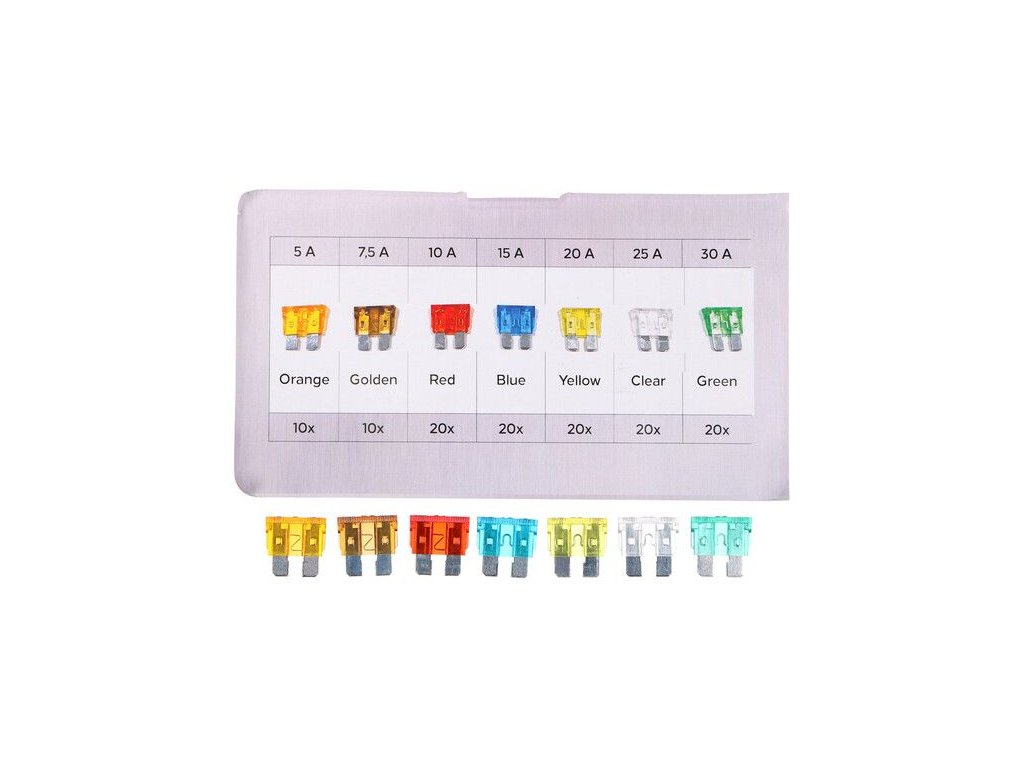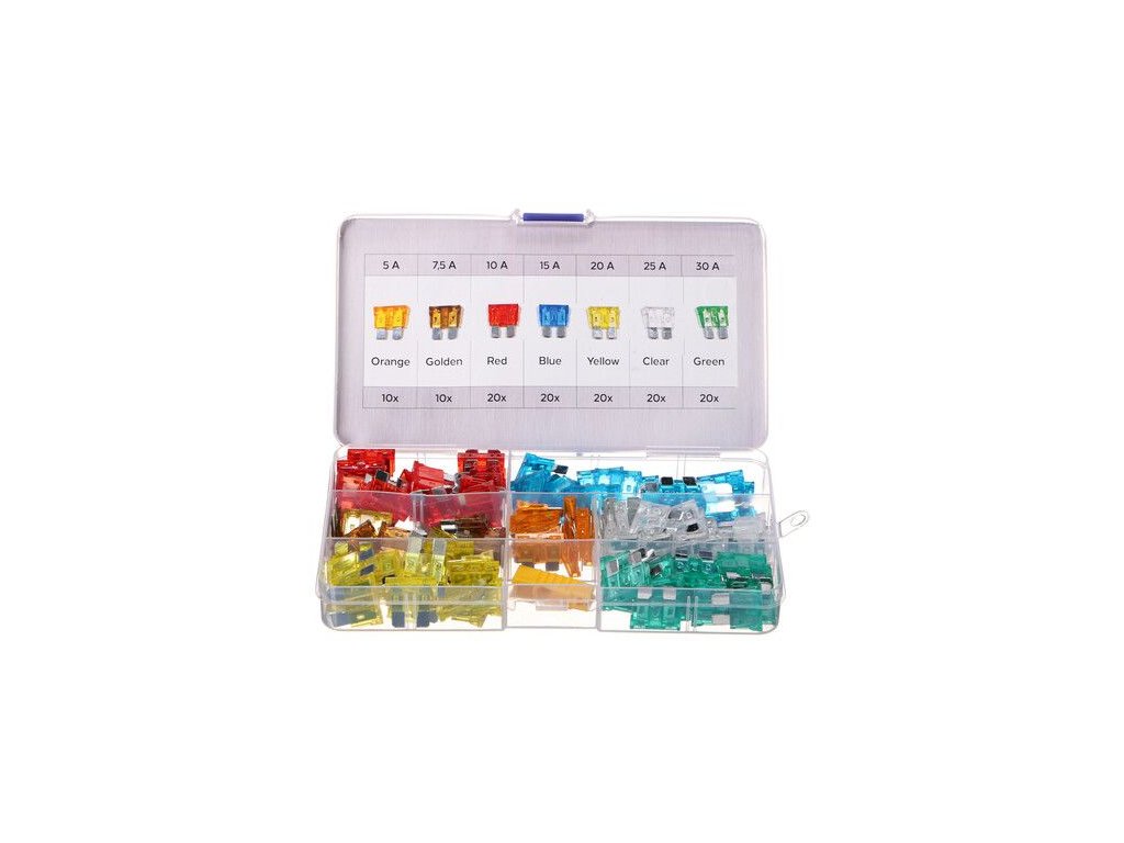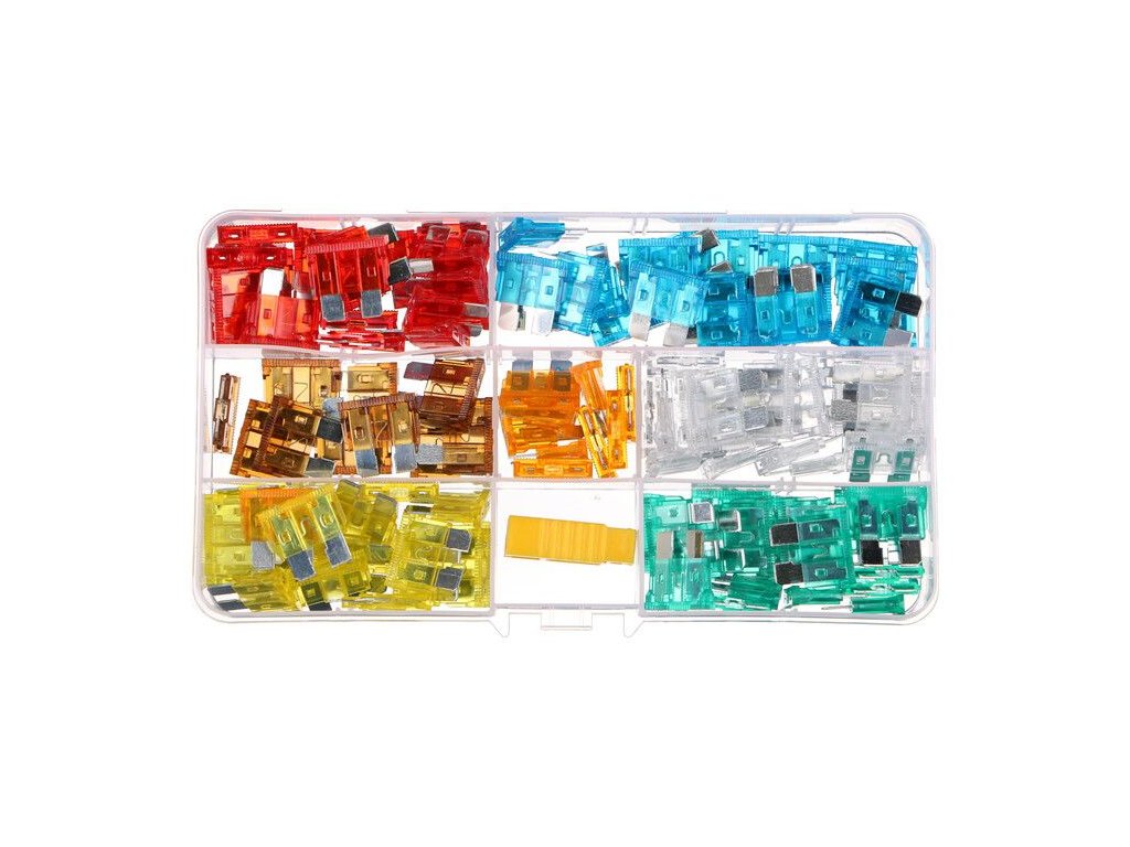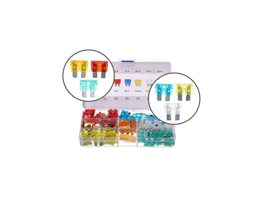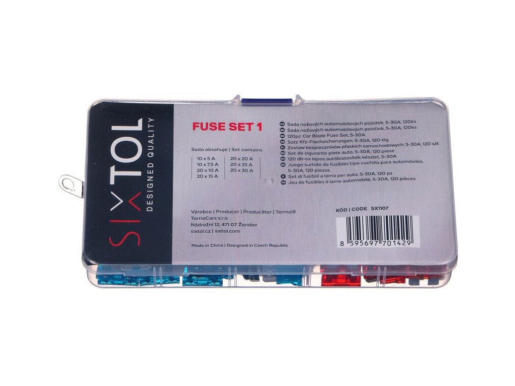 Praktická sada štandardných automobilových poistiek SIXTOL FUSE SET 1, ktorá nájde uplatnenie v každom bežnom vozidle alebo motocykli. Sada obsahuje 120 kusov nožových poistiek s menovitým výkonom od 5 do 30 A, ktoré sú rodlíšené rôznymi farbami. Poistky sú vyrobené v súlade s normou ISO8820. Každá poistka je na vrchnej strane označená príslušným nomerným prúdom, aby bolo možné poistky ľahko rozlíšiť. Celá súprava je uložená v praktickom plastovom kufríku s priehradkami.Obsah súpravy: