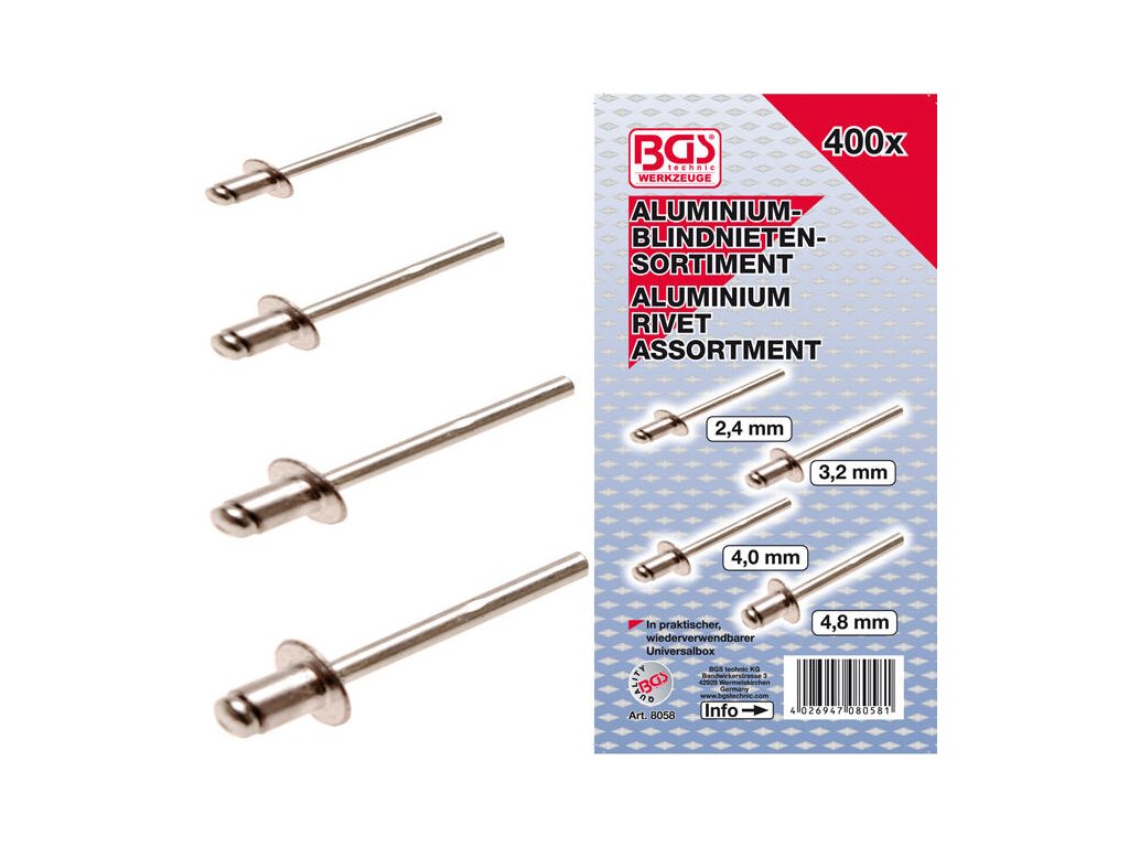 Hliníkový nity, oceľový tŕň. Sada obsahuje celkom 400 kusov.