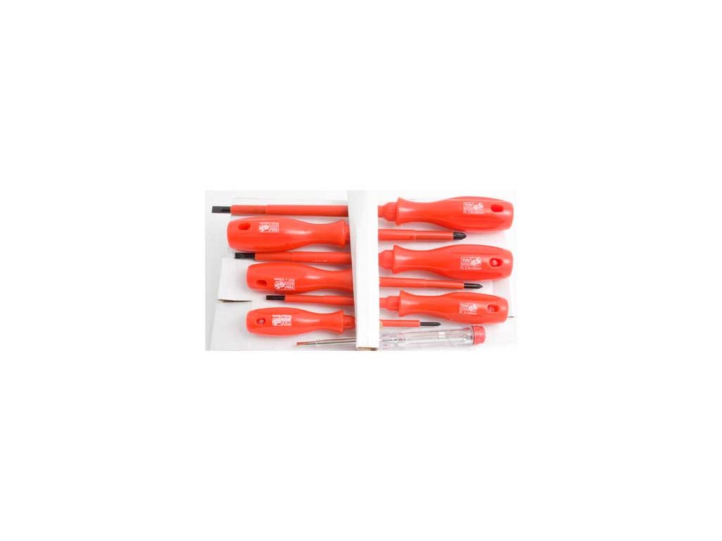 Všestranná sada obsahuje ploché a krížové skrutkovače, ako aj skúšačku napätia do 250 V.