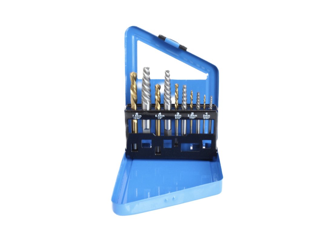 Sada ľavotočivého vrtáka a vyťahovača na odstraňovanie zlomených skrutiek, čapov, strojovo opracovaných skrutiek alebo pravotočivých tvaroviek potrubia.