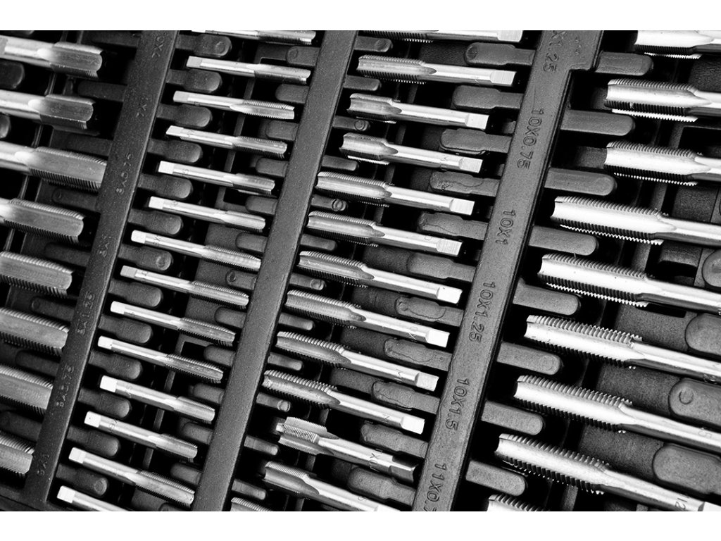 M2x0,4; M3x0,5; M4x0,7; M5x0,8; M6x0,75; M6x1,0; M7x0,75; M7x1,0; M8x0,75; M8x1,0; M8x1,25; M9x0,75; M9x1,0; M9x1,25; M10x0,75; M10x1,0; M10x1,25; M10x1,5; M11x0,75; M11x1,0; M11x1,25; M11x1,5; M12x0,75; M12x1,0; M12x1,25; M12x1,5; M12x1,75; M14x1,0; M14x1,25; M14x1,5; M14x2,0; M16x1,0; M16x1,5; M16x2,0; M18x1,5; 35 Frézy M2x0,4; M3x0,5; M4x0,7; M5x0,8; M6x0,75; M6x1,0; M7x0,75; M7x1,0; M8x0,75; M8x1,0; M8x1,25; M9x0,75; M9x1,0; M9x1,25; M10x0,75; M10x1,0; M10x1,25; M10x1,5; M11x0,75; M11x1,0; M11x1,25; M11x1,5; M12x0,75; M12x1,0; M12x1,25; M12x1,5; M12x1,75; M14x1,0; M14x1,25; M14x1,5; M14x2,0; M16x1,0; M16x1,5; M16x2,0; M18x1,52 držiaky pre závitníky: M3 - M12, M6 - M20 držiaky zápustiek: 25 mm a 38 mm, T-rukoväť pre závitníky M3 - M6.