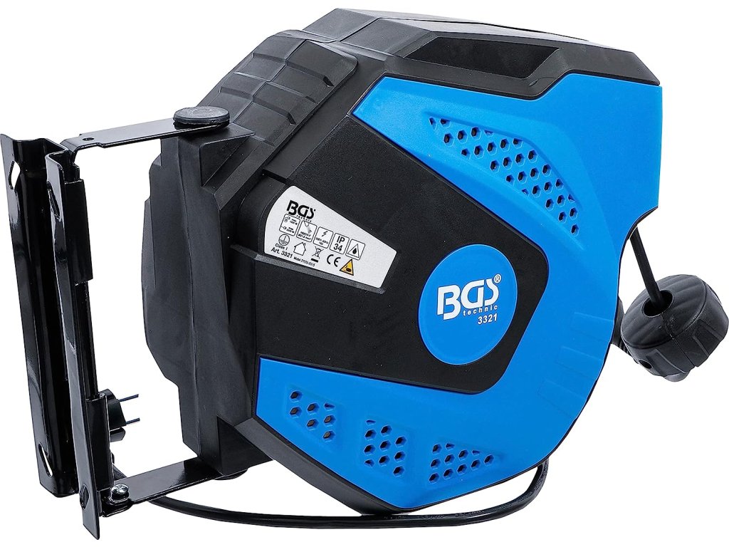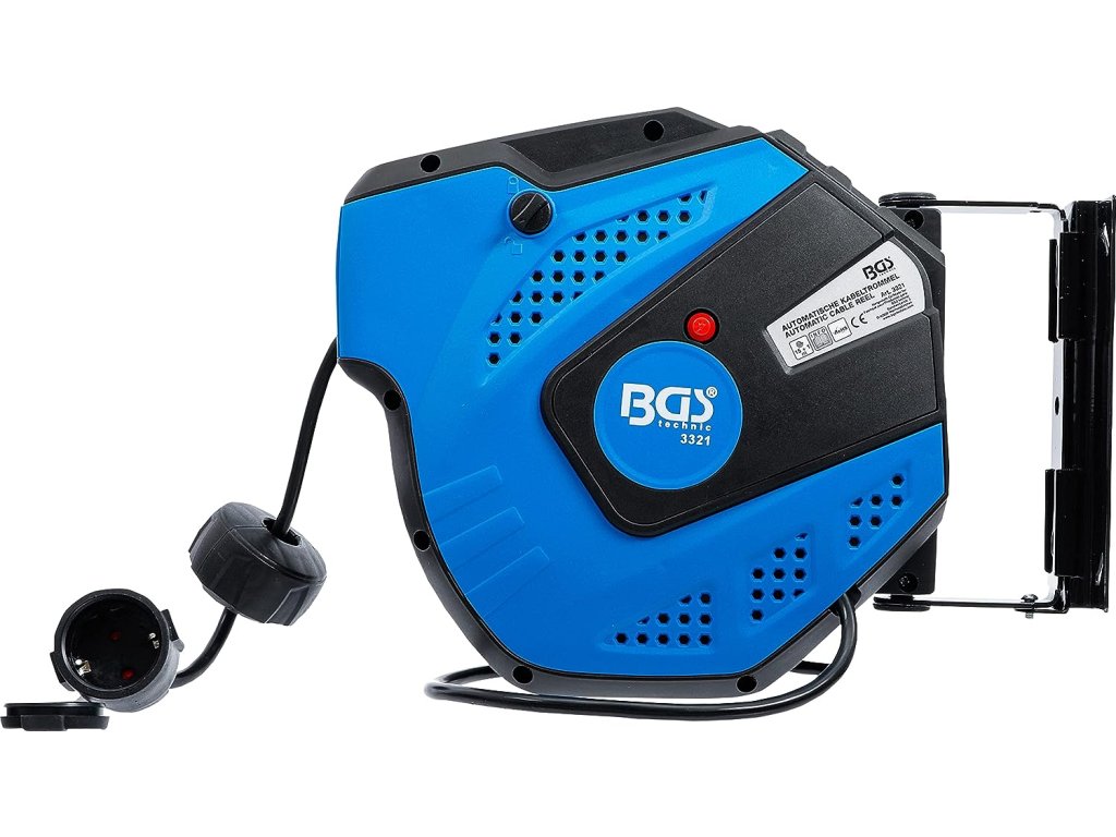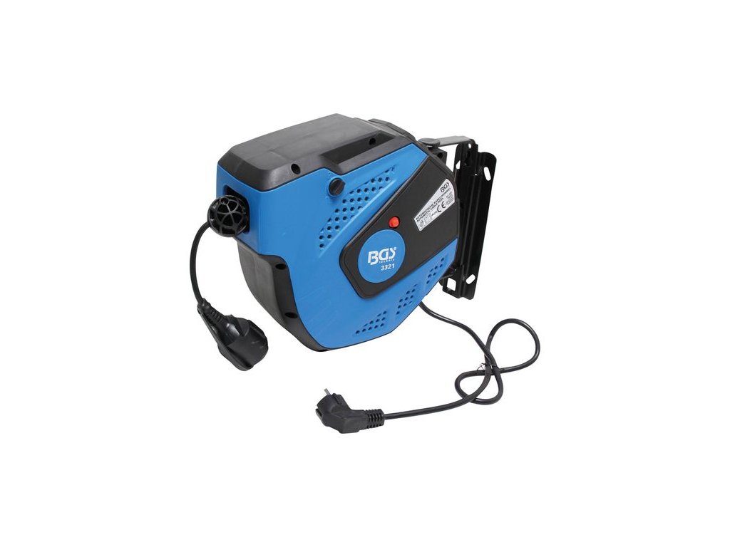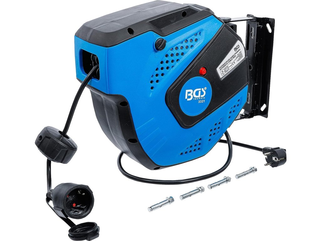Predlžovací kábel – predlžovačka dĺžky 15 metrov, pre napätie 230 voltov, automaticky navíjaná na bubne – BGS technic 3321