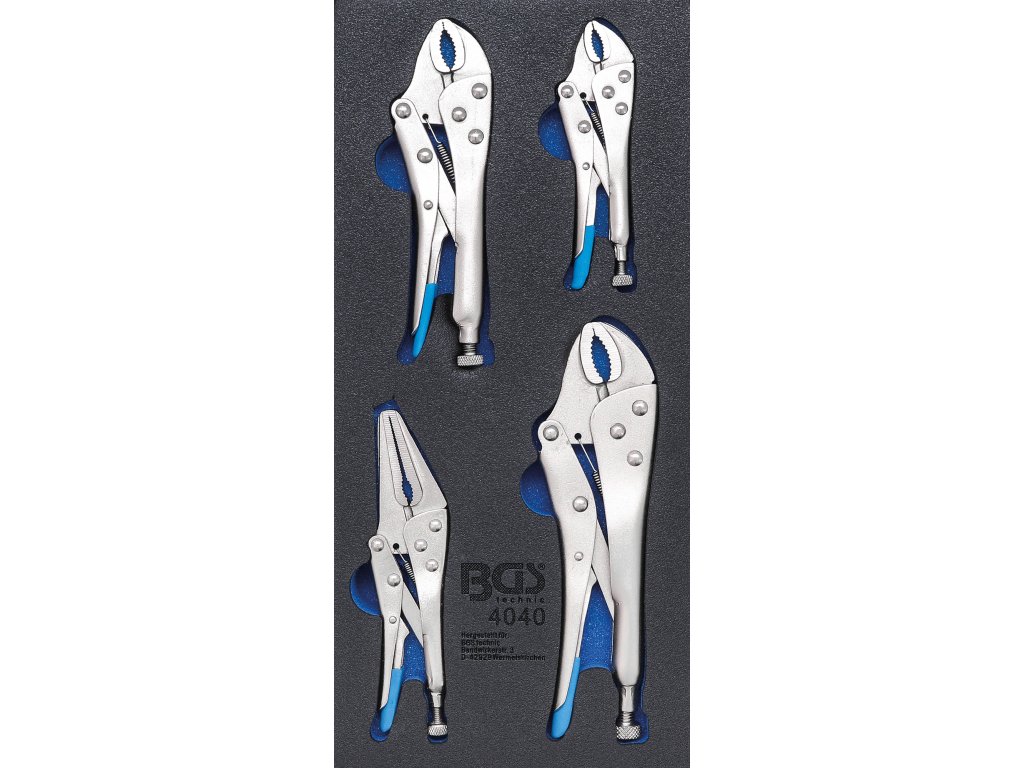 Rýchloupínacie kliešte so samosvorným mechanizmom, tzv. grip kliešte, rôzne profily čeľustí, sada 4 dielov v penovom module – BGS technic 4040