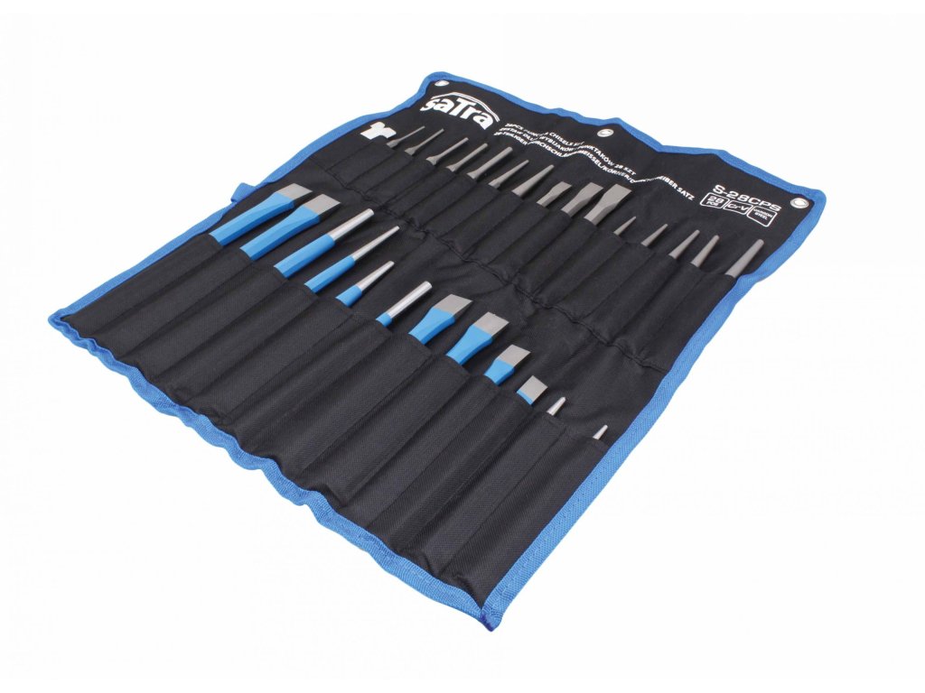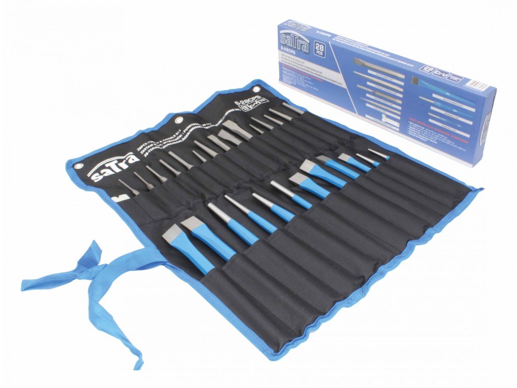 Súprava dlát, razidiel a dierovačov, 28 prvkov z chróm-vanádiovej a uhlíkovej ocele, ideálne na opracovanie dreva, kovu a iných materiálov - SATRA