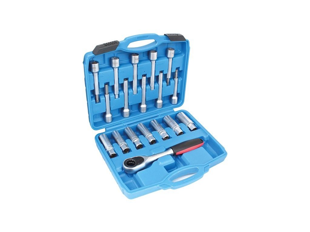 Servisná zásuvka na tlmiče, s priechodnou račňou, sada 18 dielov - SATRA - Najpredávanejší produkt