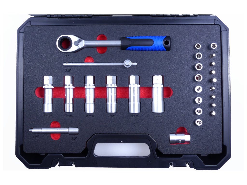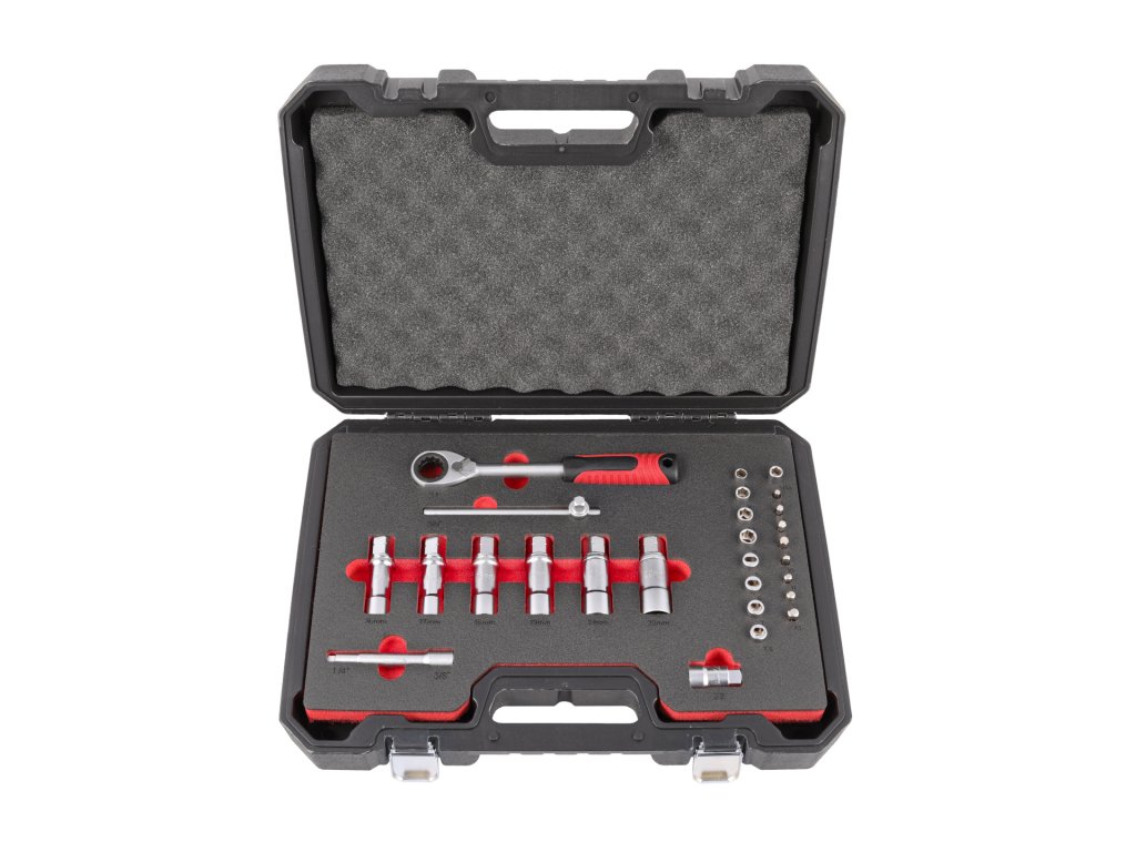 Hlavica s priechodnou račňou pre montáž a demontáž tlmičov, v plastovom kufri, sada 27 kusov – QUATROS QS80427