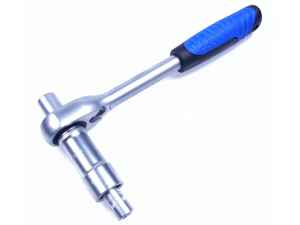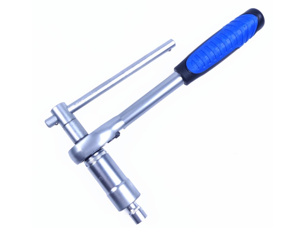 Špeciálna priechodná račňa slúži na bezpečné povolenie hornej misky tlmičov bez nutnosti zaisťovať piest proti pretáčaniu kliešťami alebo zverákom – nehrozí tak jeho poškodenie. Piest sa zaistí zhora dlhým kľúčom prestrčeným cez priechodnú hlavicu; touto hlavicou sa potom povolí skrutka horného uloženia tlmiča.