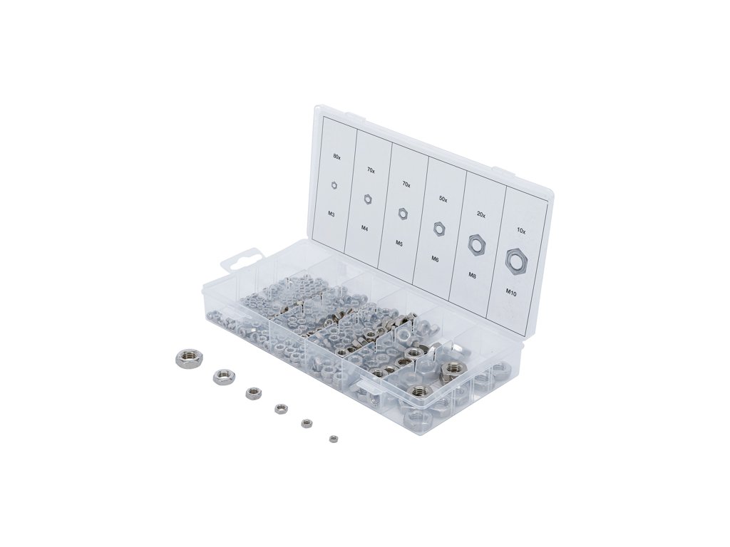 Šesťhranné matice z nehrdzavejúcej ocele s metrickým závitom, rozmery M3 až M10, sada 300 kusov v plastovej škatuli - BGS tecnic 74249