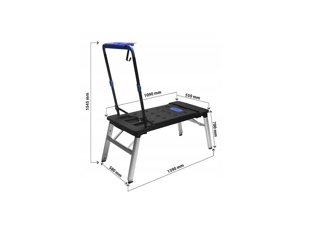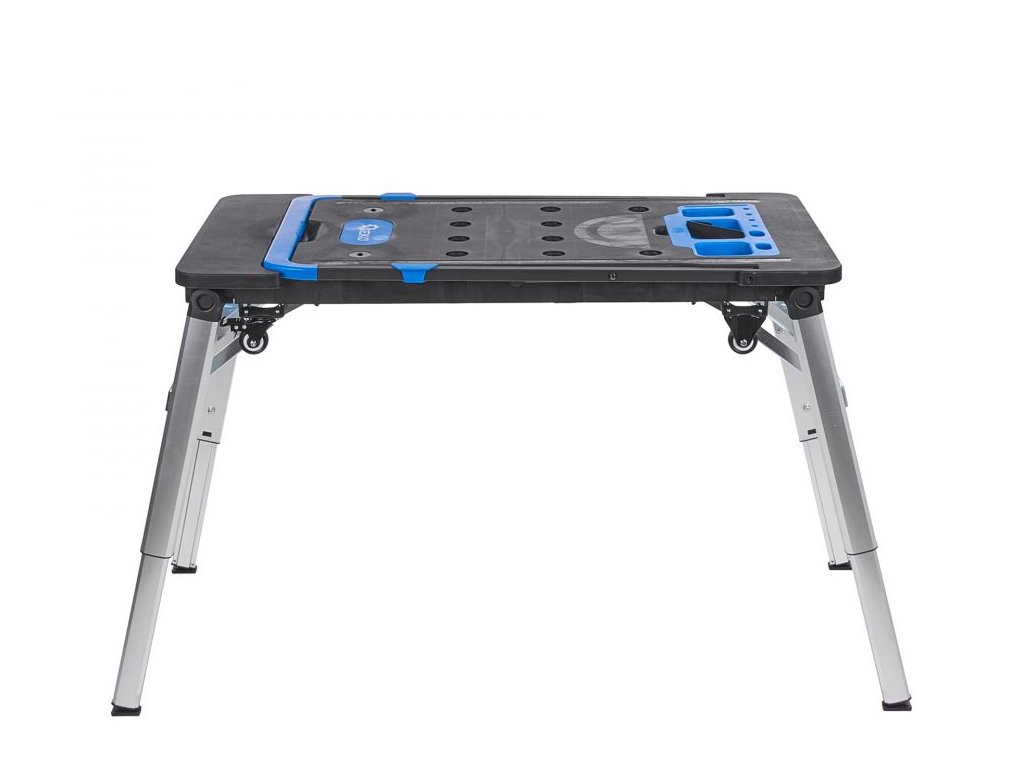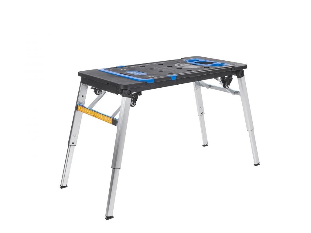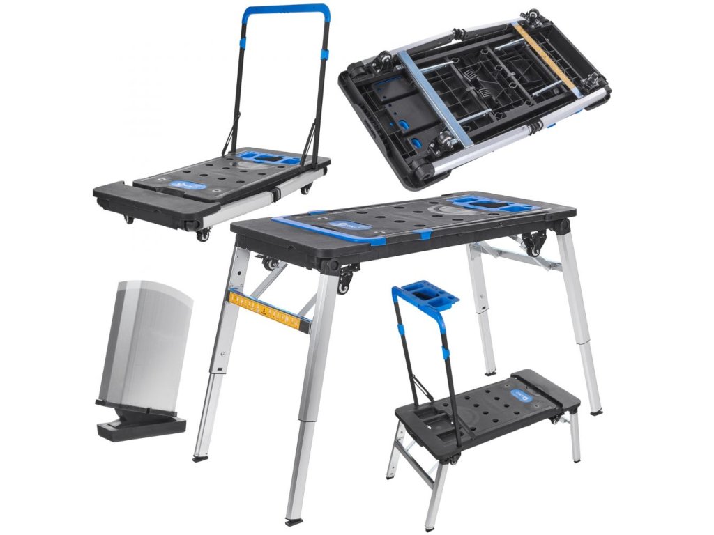 Sklopné teleskopické nohy zabezpečujú stabilitu pri práci, zatiaľ čo štyri kolieska vrátane dvoch otočných koliesok uľahčujú premiestňovanie stola. Sklopná rukoväť slúži nielen ako rukoväť vozíka plošiny, ale aj ako podpera nádoby na drobné náradie alebo skrutky.