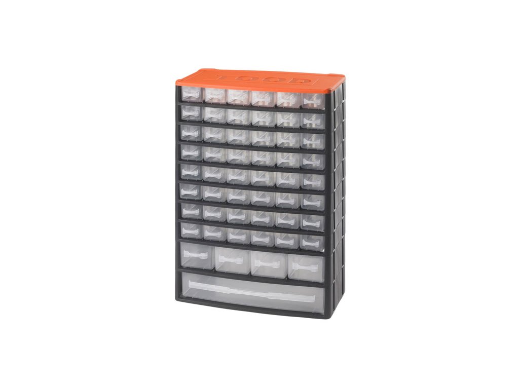 Vybavené 53 vysúvacími priehradkami (zásuvkami) v troch rozmeroch, uložených do desať poschodí. Do 48 malých zásuviek uložíte drobnosti ako spojovací materiál (skrutky, matky, klince atď.), 4 stredné sú vhodné aj na menšie kusy náradia (napr. Gola hlavice), najväčší spodné pojme aj skrutkovače, kľúče a ďalšie ručné náradie.