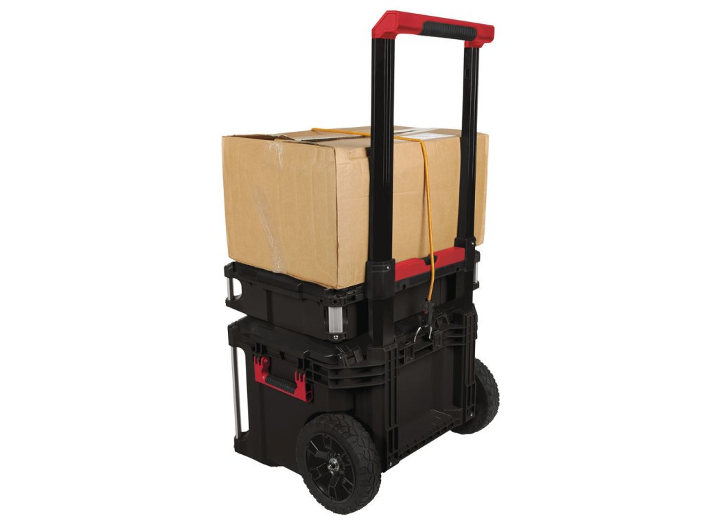 Masívny pojazdný kufor na prevoz a uskladnenie rôznych druhov náradia. Veľké kolesá s hrubým vzorom zaručujú dobrú priechodnosť aj horším terénom, vďaka vysúvaciemu madlu je prevoz pohodlný.