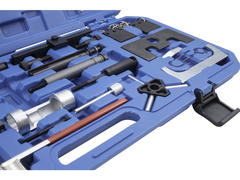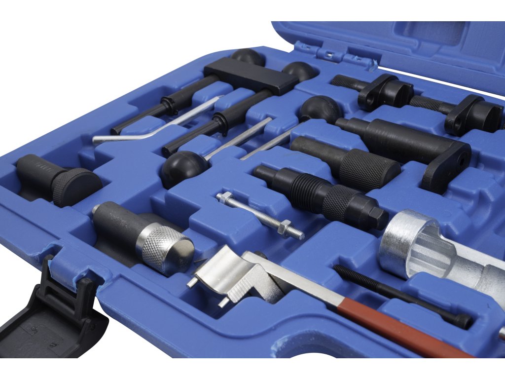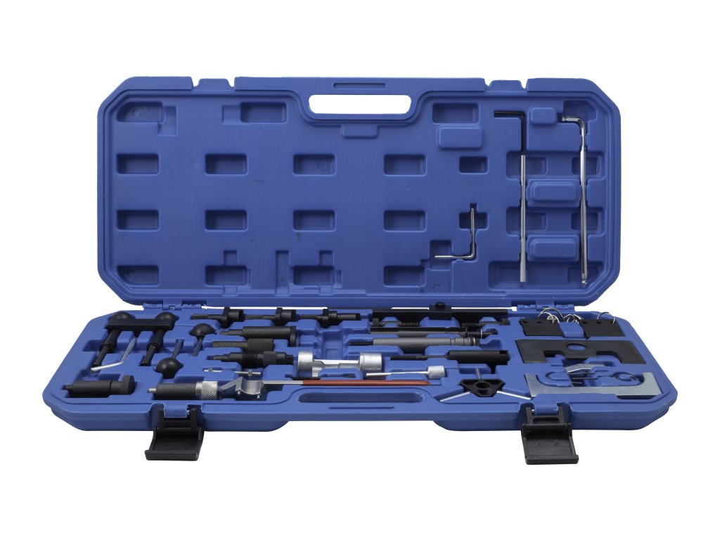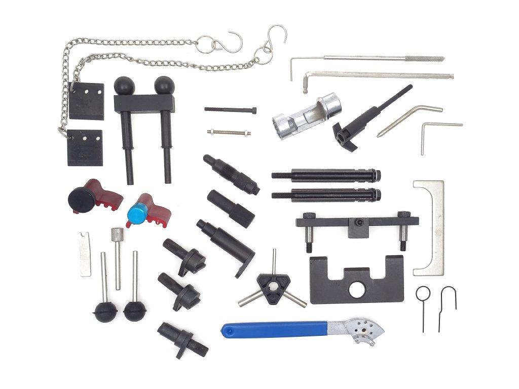 Set obsahuje 32 kusov rôznych prípravkov aretáciou kľukového hriadeľa, vačkových hriadeľov, vstrekovacích čerpadiel, kľúč na napínacie kladku, kľúč na lambda sondu a iné pomôcky a prípravky.