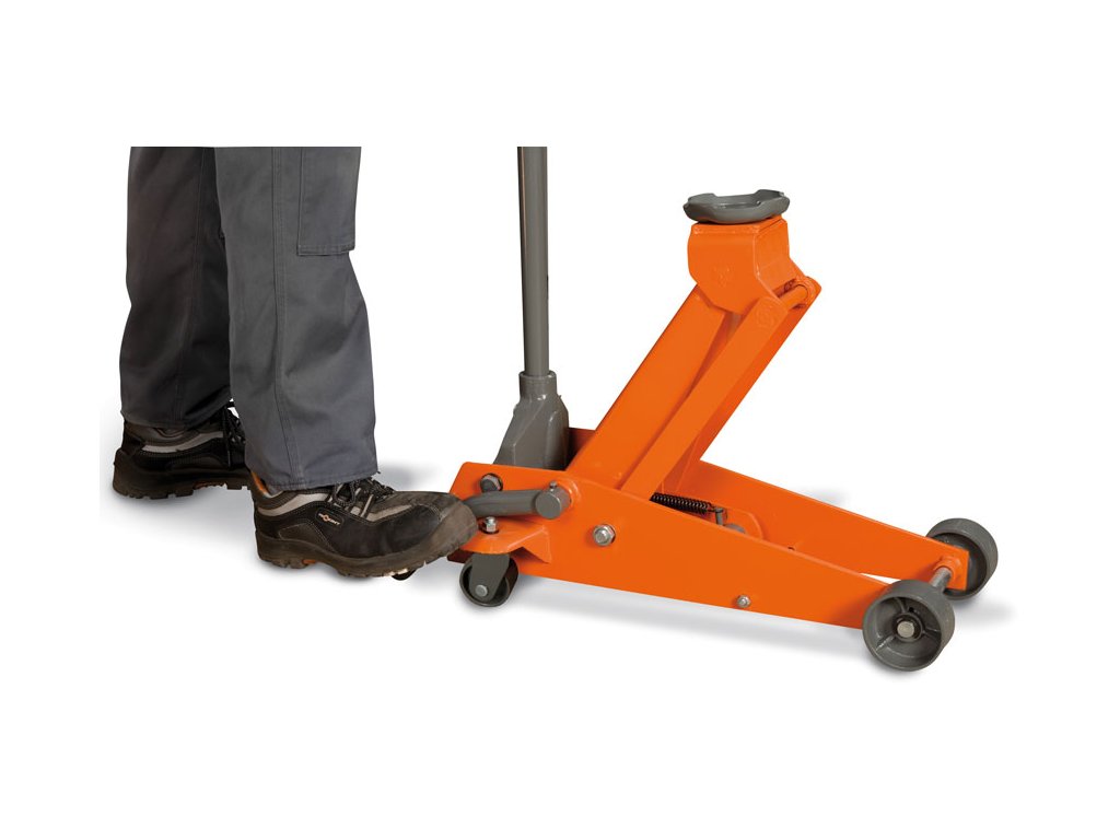 Nízkoprofilový pojazdný dielenský zdvihák, ovládaný tyčou a nožným pedálom.