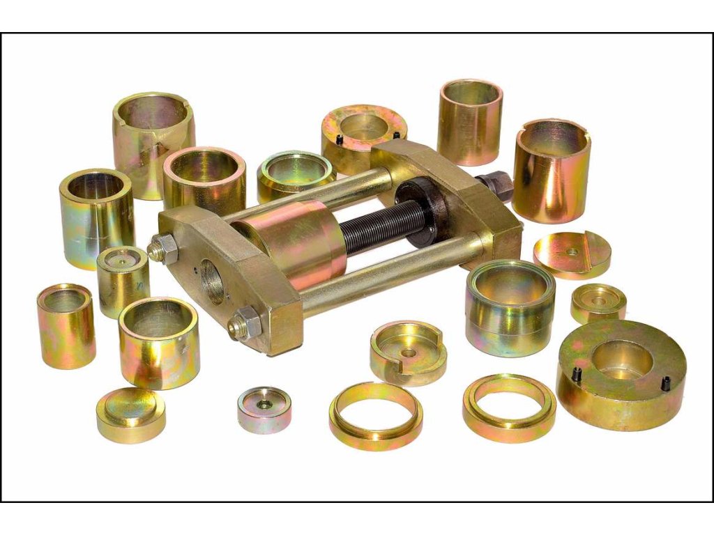 Špecifikované na lisovanie a lisovanie horných a dolných guľových čapov ramien prednej nápravy. Súprava umožňuje demontáž a montáž spodných čapov priamo na vozidle.