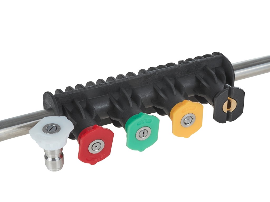 - Biela tryska (40°): Špeciálne navrhnutá na čistenie skla a okien, poskytuje stabilný a účinný prúd bez rizika poškodenia citlivých povrchov.