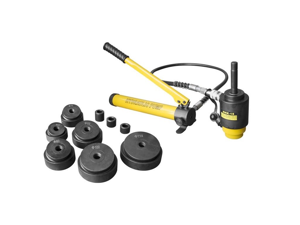 Nástroj pre presné dierovanie (priemer 63-114 mm) oceľových plechov do hrúbky 4,0 mm pre priemysel, remeselníkov, na stavby (inštalačné práce, výroba rozvádzačov a pod.) A ďalšie miesta. Skladá sa z ručnej hydraulickej pumpy, tlakové hadice dĺžky 150 cm a vojne, na ktorý sa inštalujú pracovné adaptéry.