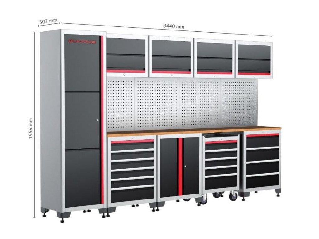 Vysoko praktická súprava nábytku pre autoservisy, profesionálne dielne, priemysel ale aj domáceho hobby používateľa. Umožňuje pohodlné uskladnenie veľkého množstva náradia a vybavenia, vďaka integrovanému náraďovému vozíku je možné navyše časť vecí ľahko prevážať.