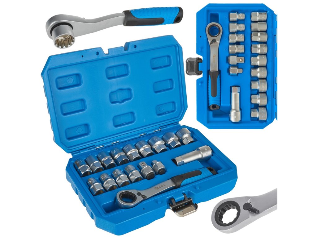 Multiprofilová holá sada Gear Lock, s priechodnou račňou a nástrčnými hlavicami, 17 kusov v plastovej kazete