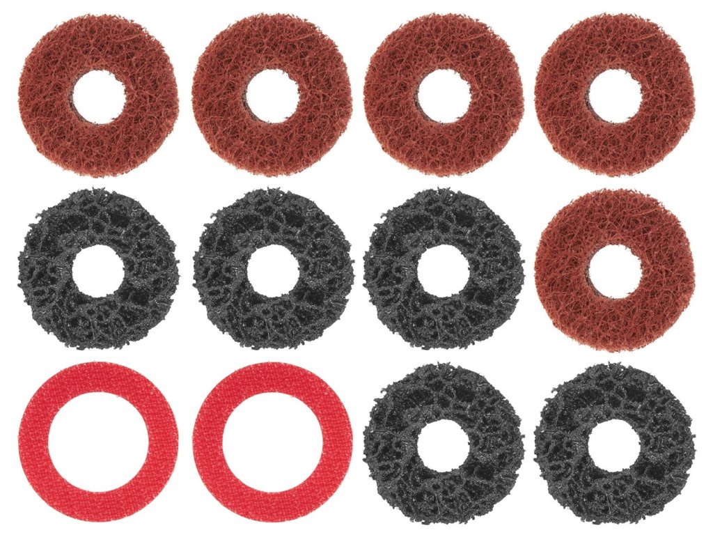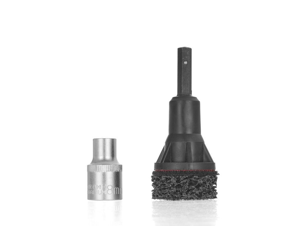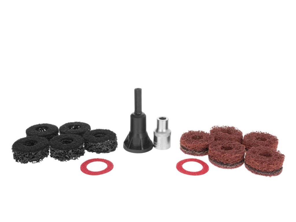 Súprava štrnástich dielov na čistenie nábojov a čapov kolies, na upínanie do vŕtačky, vrátane 1/2" adaptéra na príklepový kľúč