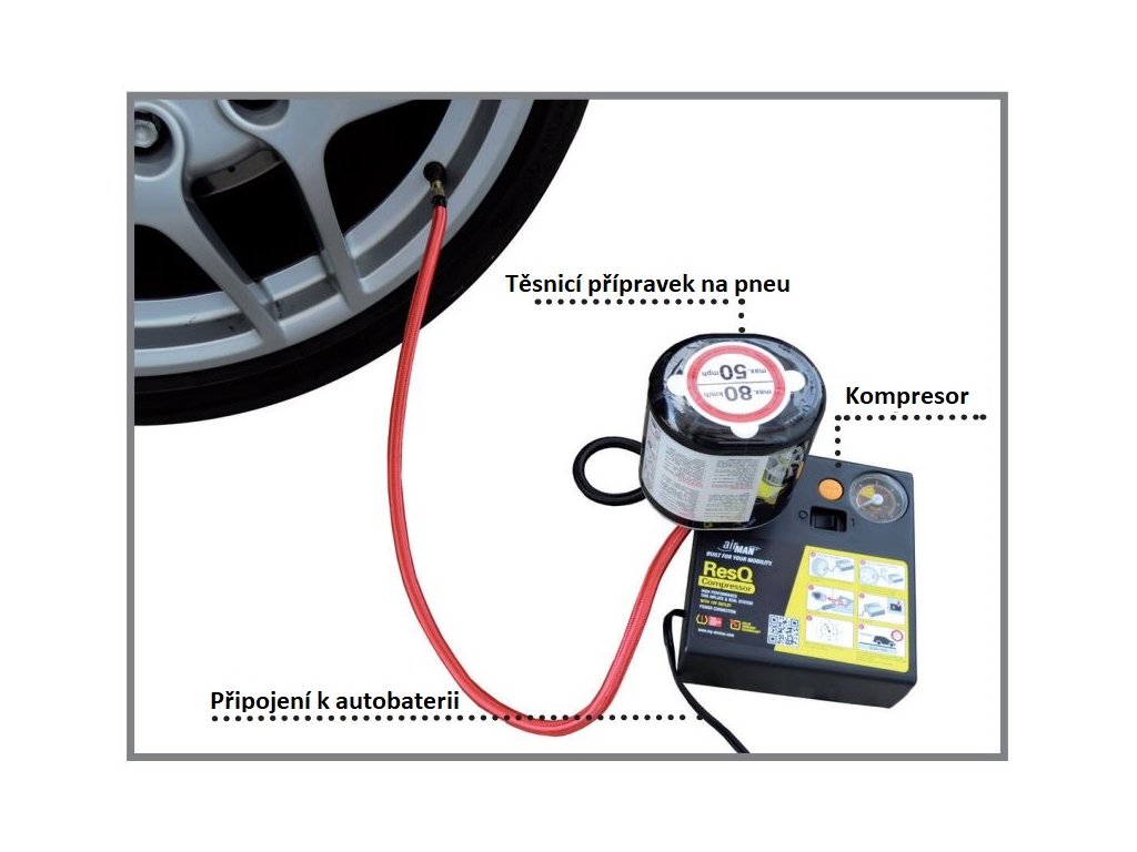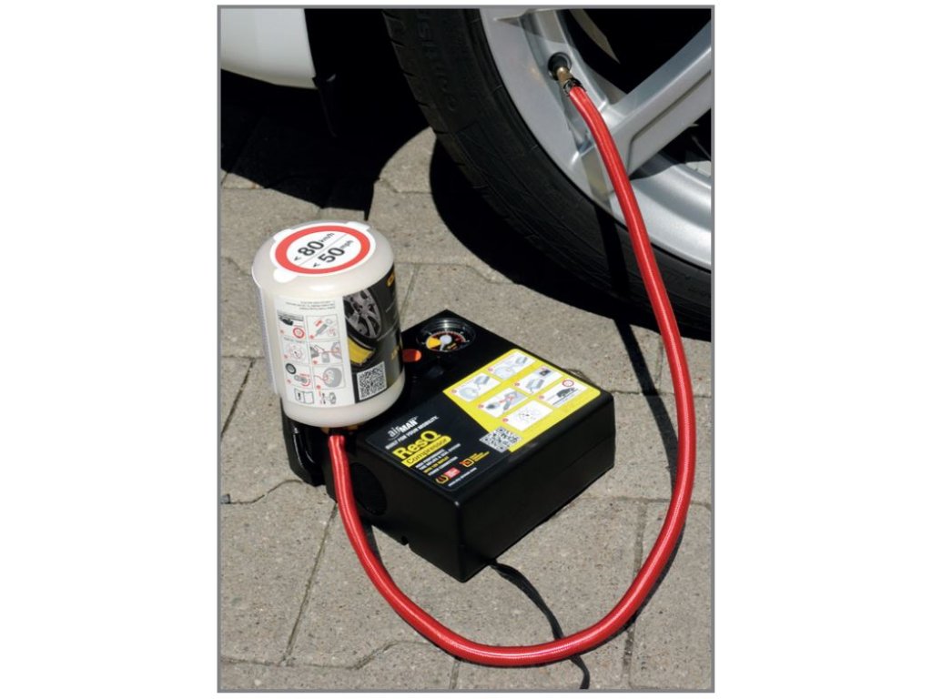 Určené pre opravu poškodeného plášťa kolesa priamo na ceste. Zostava obsahuje všetko potrebné na zalepenie prepichnuté pneumatiky a jej nahustenie - kompresor, opravný gél (lepidlo) a sada adaptérov.