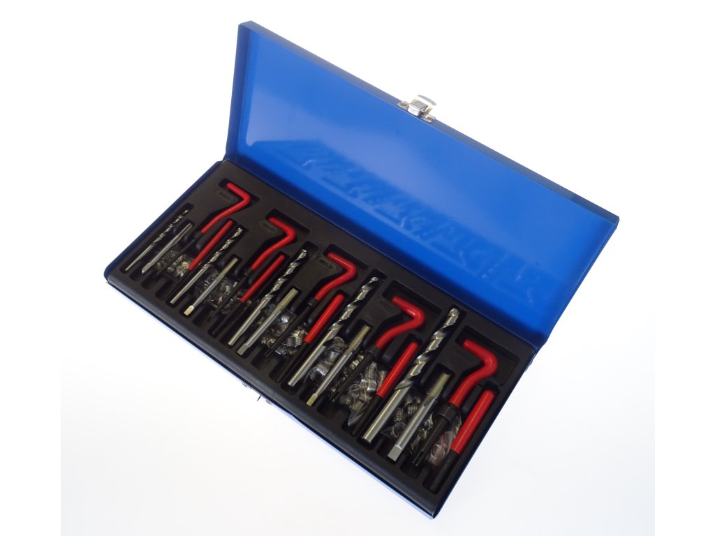 Prakticky zostavená sada 110 závitových vložiek a pomocných nástrojov. Umožňuje odstránenie starého závitu a inštaláciu náhradnej vložky.