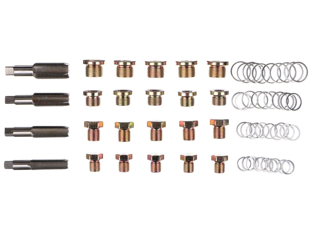Univerzálna sada nástrojov je určená na opravu poškodených závitov olejovej vane. Sada obsahuje závitníky, skrutky a podložky vo veľkostiach M13 - M20 vyrobené z odolnej HSS ocele, ktoré sú vhodné pre väčšinu automobilov nielen na opravu poškodených závitov olejovej vane, ale aj na vypúšťacie a kontrolné skrutky prevodovky, diferenciálu alebo prevodovky.