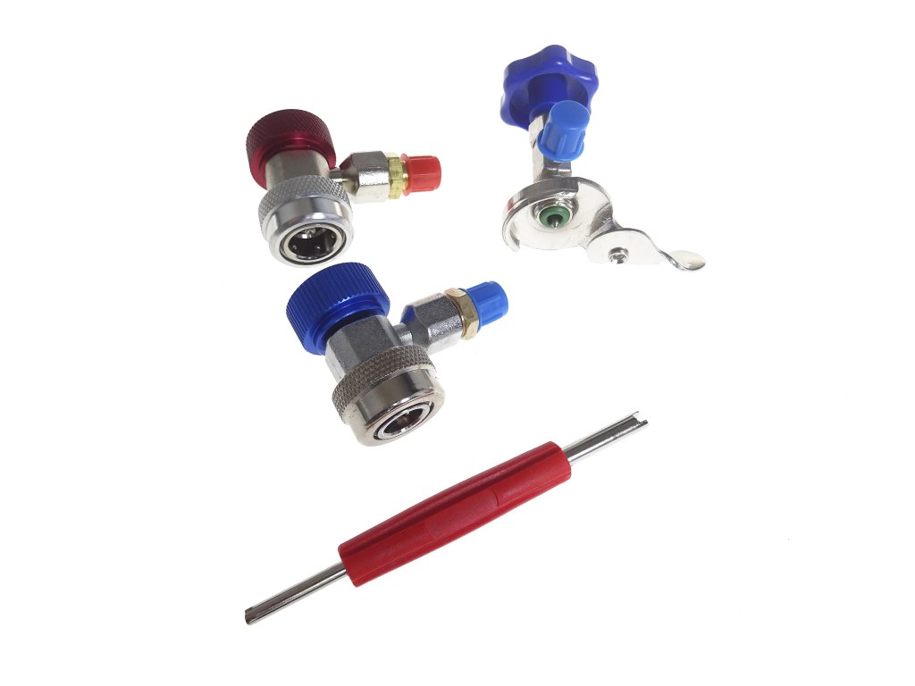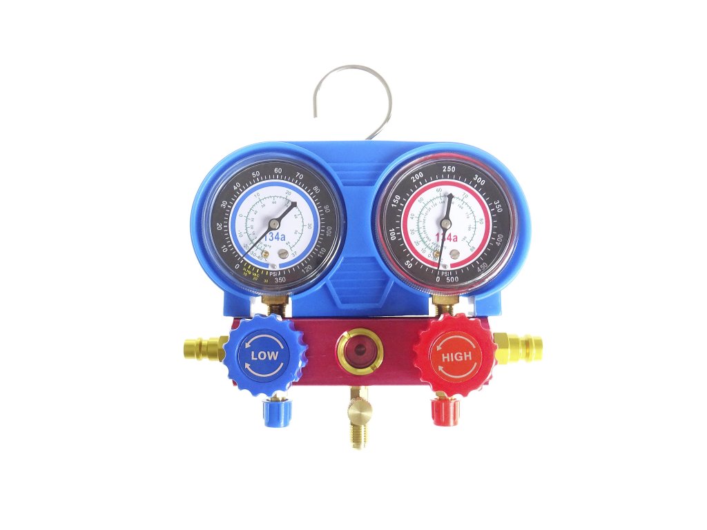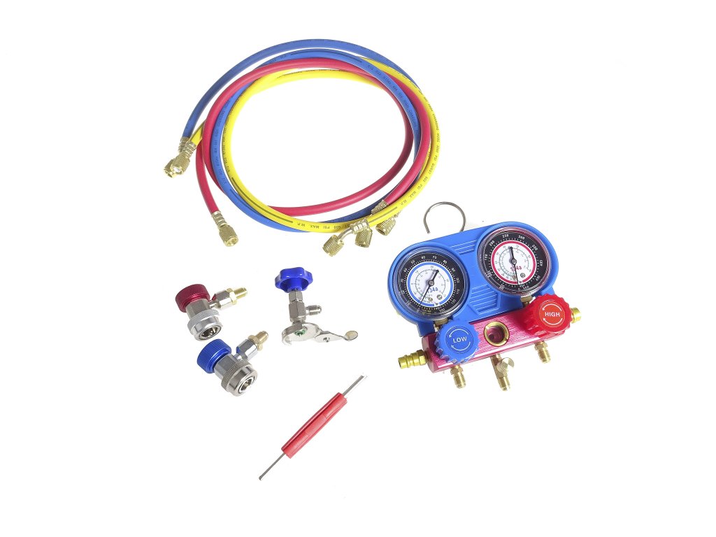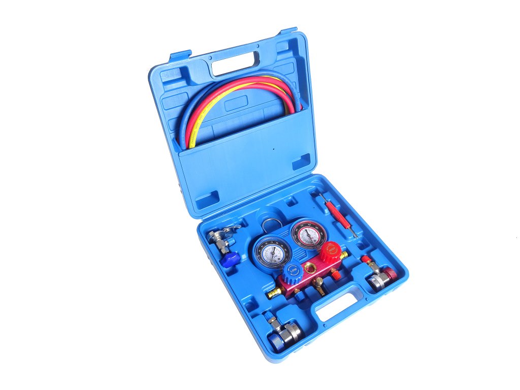 Kompletná súprava prípravkov na plnenie chladiva do automobilovej klimatizácie. Súprava obsahuje dvojicu manometrov na meranie tlaku vo vysokotlakovom (červený) aj nízkotlakovom (modrý) okruhu vrátane zápornej stupnice na testovanie tesnosti celého chladiaceho systému (na overenie, či po naplnení nebude dochádzať k úniku chladiva).