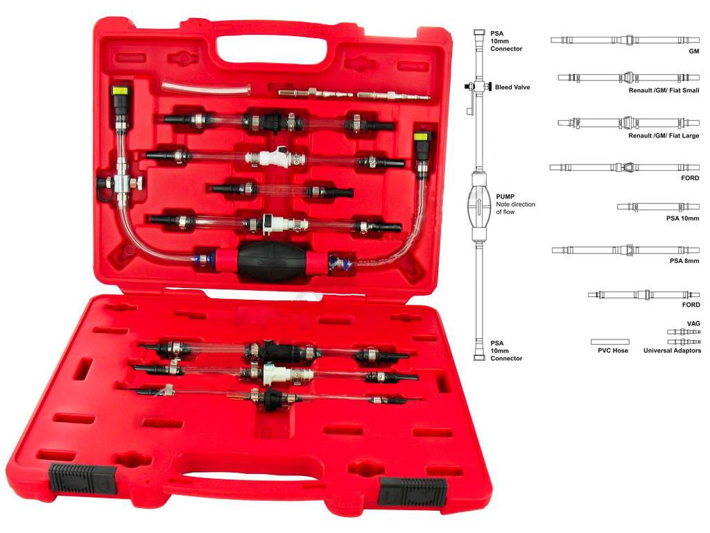 Sada v plastovom kufríku belgického dodávateľa Hubitools obsahuje 10 adaptérov umožňujúcich odvzdušňovanie a plnenie palivových filtrov, čerpadiel a systémov dieselových motorov.