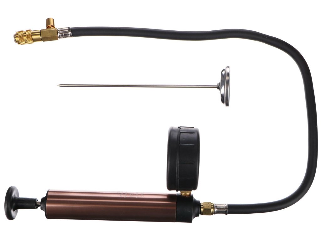 Súprava na rýchlu kontrolu tesnosti chladiaceho systému. Súprava obsahuje 18 nástavcov a adaptérov pre rôzne značky automobilov a teplomer na meranie teploty chladiacej kvapaliny so stupnicou 0-200 °C a 0-400 °F.