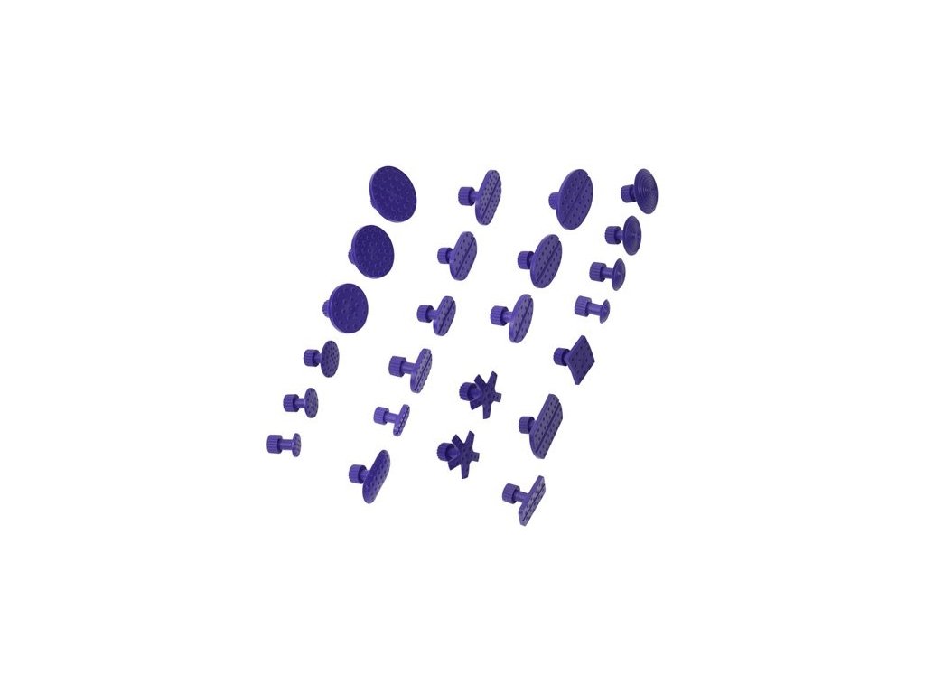 Sada (23 ks) modrých plastových (PA) nalepovacích vyťahovacích adaptérov so štandardnou hlavou pre opravy jamiek a promáčklin na karosériách vozidiel technológií PDR (Paintless Dent Repair).