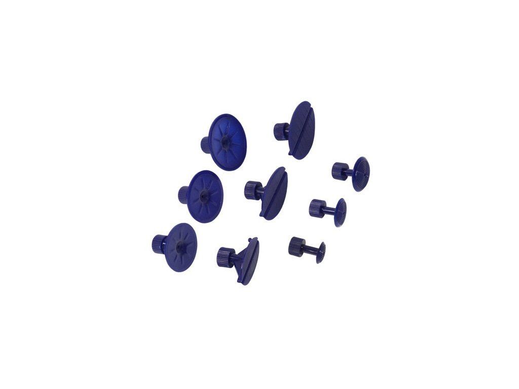 Sada (9 ks) modrých plastových (PA) nalepovacích vyťahovacích adaptérov s vyššou hlavou pre opravy jamiek a promáčklin na karosériách vozidiel technológií PDR (Paintless Dent Repair).