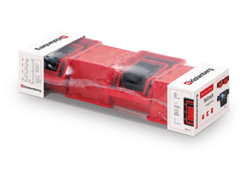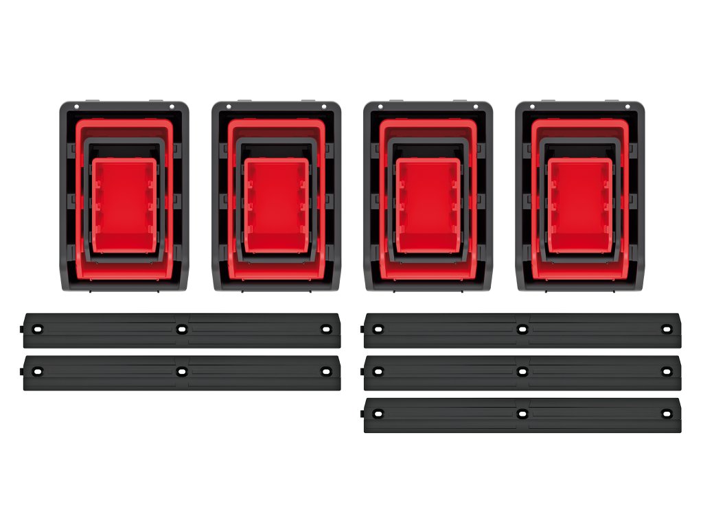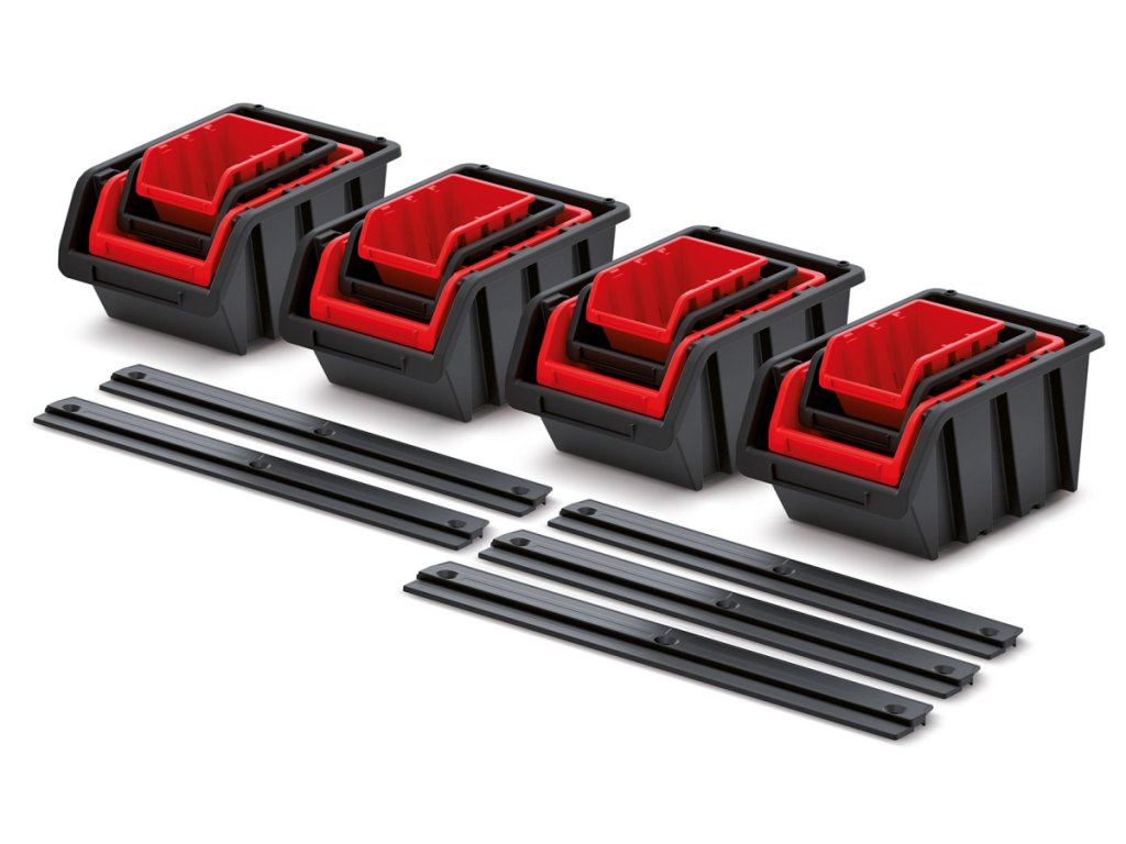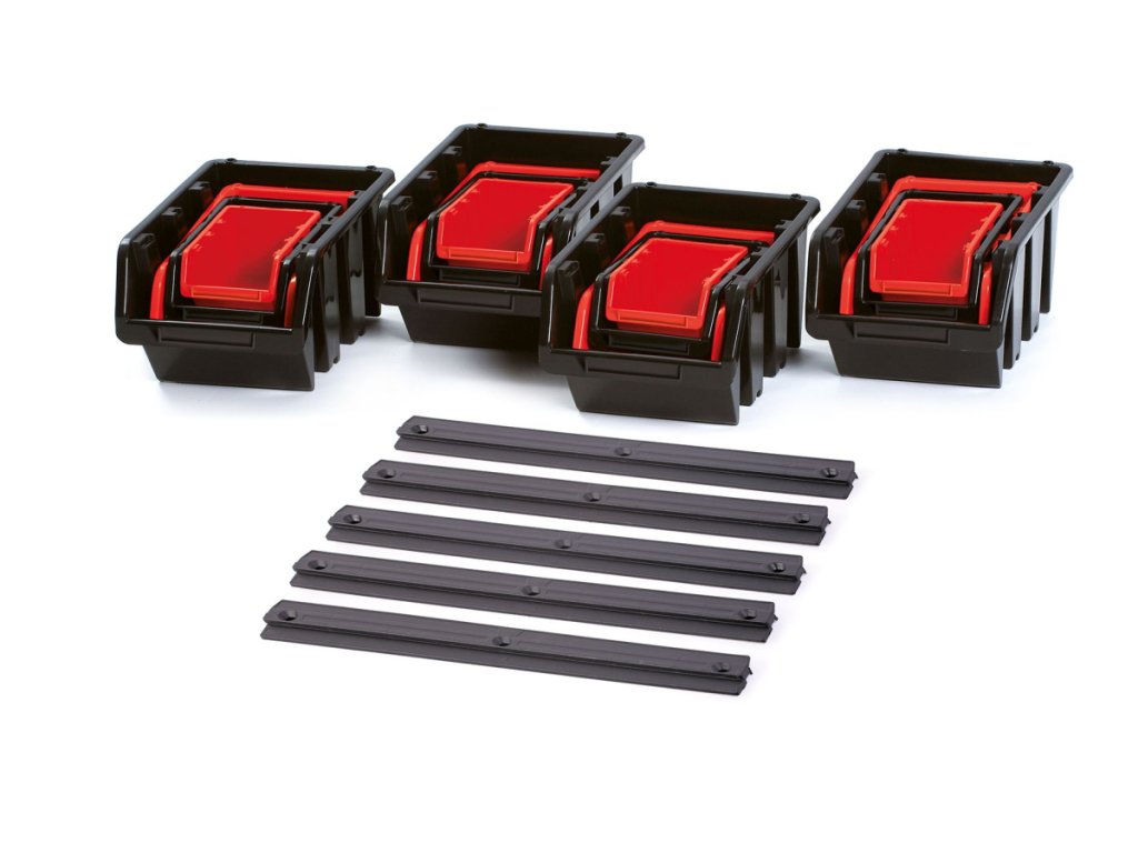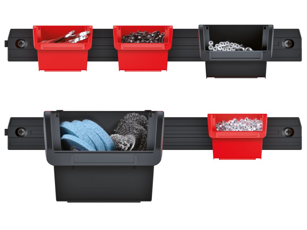 Súprava plastových boxov s nástennou lištou, 580 x 230 x 130 mm, 16 boxov + 5 lišt - Kistenberg