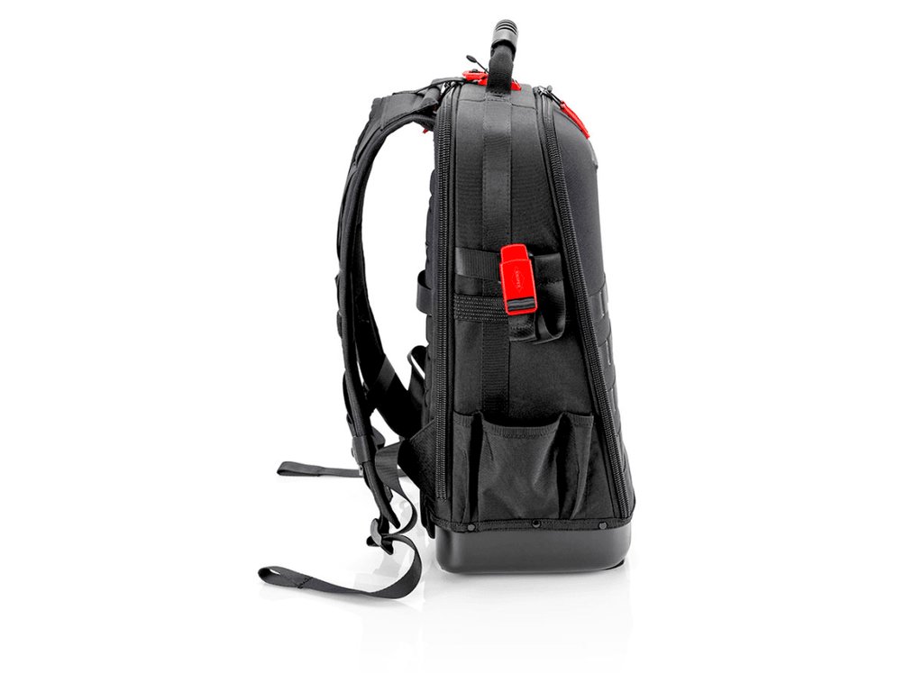 Vodoodolné ergonomické polstrovanie na chrbte s rýchloupínacou prackou FIDLOCK na spevnenie nosného systému zabezpečuje pohodlné nosenie náradia. Tvarované 6 cm vysoké dno z nárazuvzdorného a vodeodolného plastu zaisťuje bezpečnú vzpriamenú polohu pri otváraní a zatváraní.