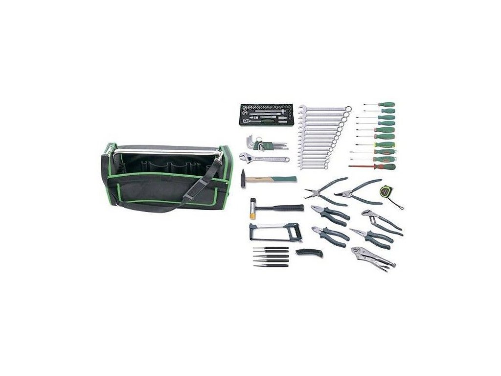 Vysoko prakticky poskladaná zostava náčinia s univerzálnym využitím v autoservise, dielni, domácnosti a inde. Je uložená v kvalitnej montérskej taške s madlom a popruhom cez rameno – neustále máte všetko pri sebe.