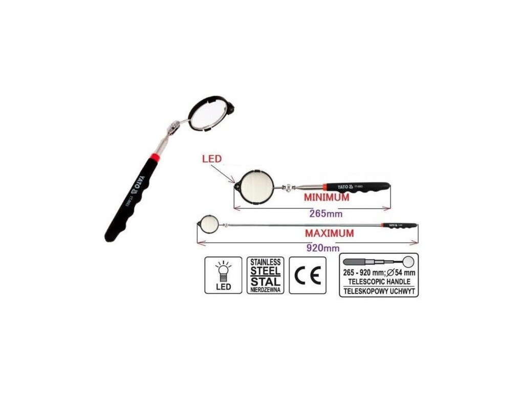 Profesionálne inšpekčné zrkadlo s LED osvetlením a teleskopickým predĺžením pre kontrolné práce YT-0663. Vďaka svojim variabilným rozmerom sa hodí všade, kde je zlý prístup a pre miesta, ktoré by bez demontáže ďalších súčastí neboli dostupné. S LED osvetlením sa už žiadne kontrolované miesto v tme neschová!