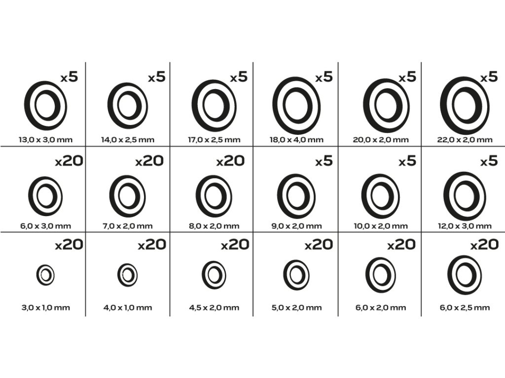 Krúžky sú uložené v praktickom plastovom boxe na ľahkú orientáciu.5 mm), 20 x (6 x 3 mm), 20 x (7 x 2 mm), 20 x (8 x 2 mm), 5 x (9 x 2 mm), 5 x (10 x 2 mm), 5 x (12 x 3 mm), 5 x (13 x 3 mm), 5 x (14 x 2,5 mm), 5 x (17 x 2,5 mm), 5 x (18 x 4 mm), 5 x (20 x 2 mm), 5 x (22 x 2 mm)