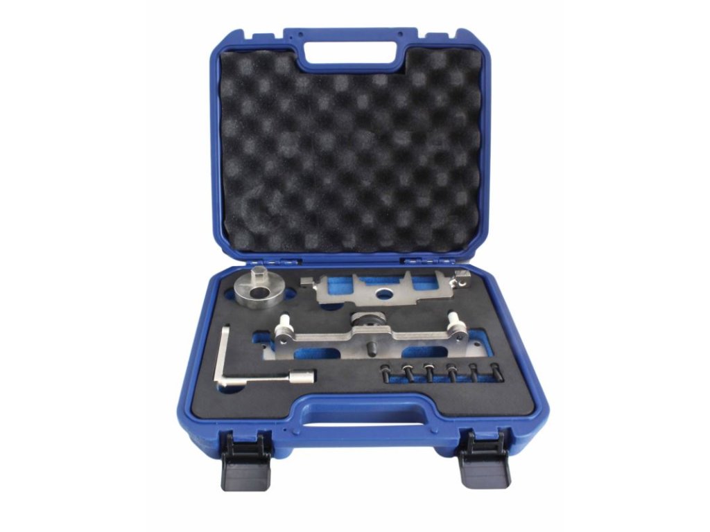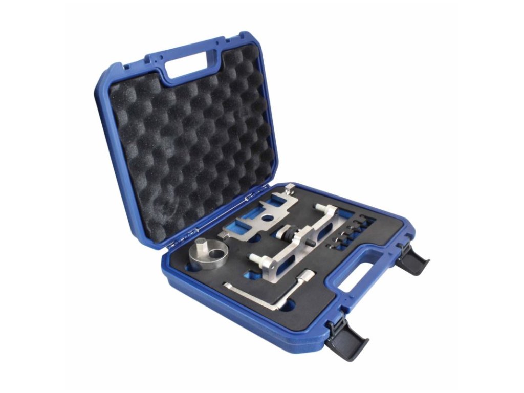 Kvalitná sada prípravkov na uzamknutie rozvodu pri výmene rozvodovej reťaze a ozubených kolies vačkového hriadeľa u vozidiel Mercedes-Benz s motormi 1.8, 2.1 a 2.2 M651 Diesel.