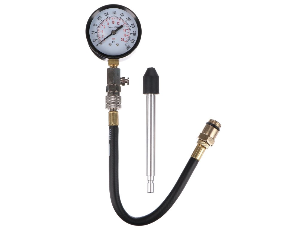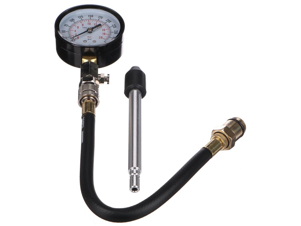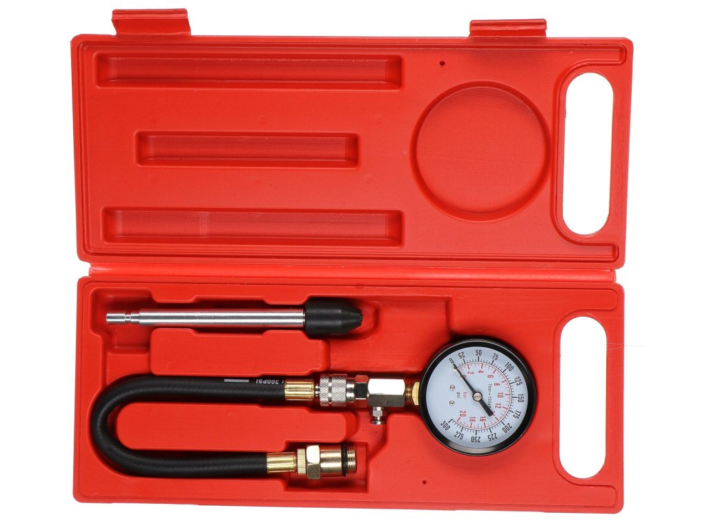 Súprava na testovanie kompresie benzínového motora s analógovým tlakomerom je určená na zisťovanie opotrebovania a netesností okolo piestnych krúžkov a iných nedostatkov spôsobujúcich úniky tlaku motora.