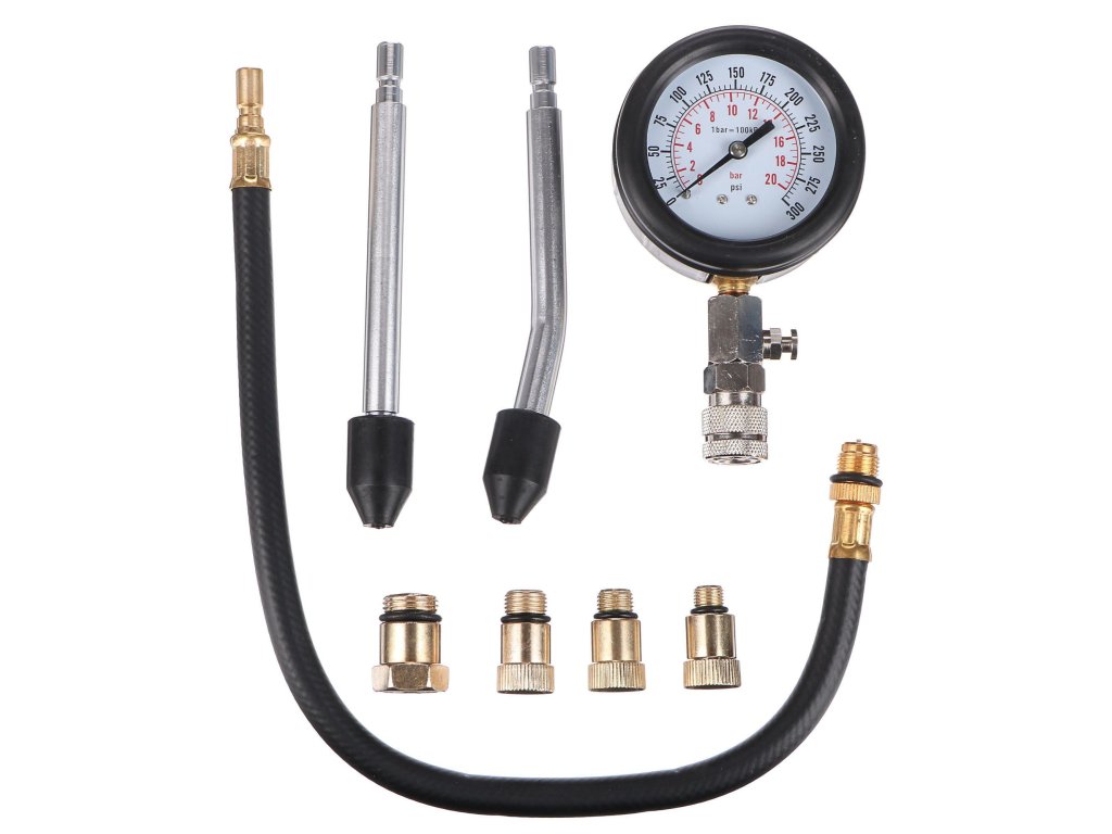Súprava na testovanie kompresie benzínového motora s analógovým tlakomerom je určená na zisťovanie opotrebovania a netesností okolo piestnych krúžkov a iných nedostatkov spôsobujúcich úniky tlaku motora.